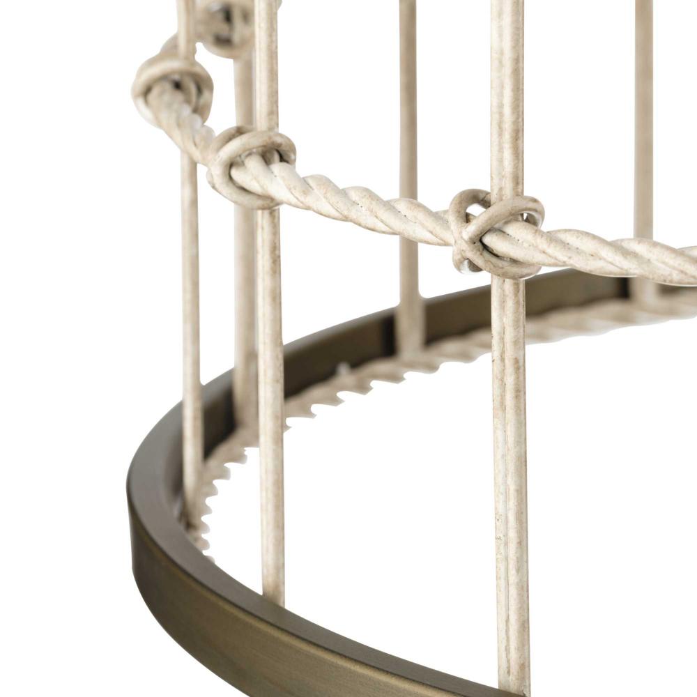 Inside the woven frame is a five-light cluster in a warm aged brass finish.
