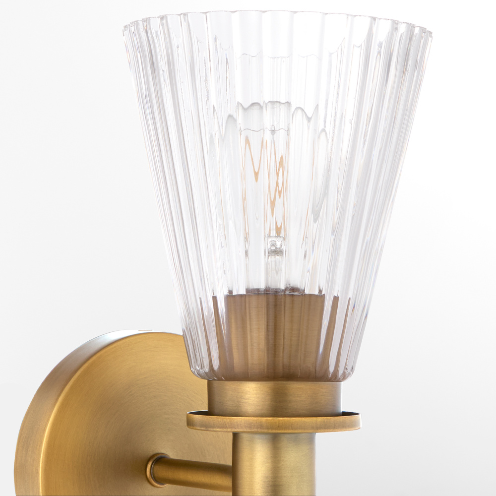 Lawton is a playful transitional series featuring pleated conical glass, ramped arms, and contemporary finishing. Early American and European styles inspired the clean bobeche, breaks, and steps in the details. Available in matte black or brushed brass, this wall mount offers versatility with 1 or 2 light options. Whether placed in living rooms, kitchens, or entryways, Lawton adds a welcoming touch to any décor.