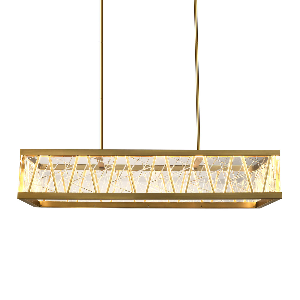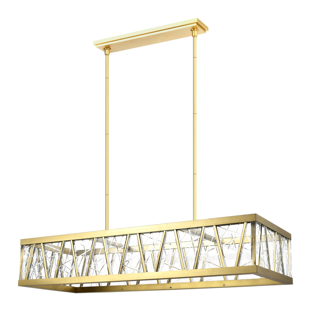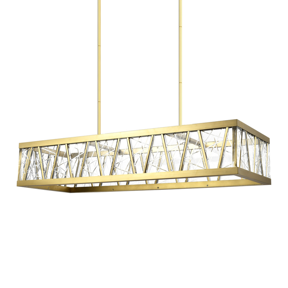 LED 48" grand rectangular crystal chandelier with thick heavy gauge engraved triangular crystals and refined metal in our premium aged brass finish. Integrated Replaceable LED with 3CCT 3000K, 3500K and 4000K.