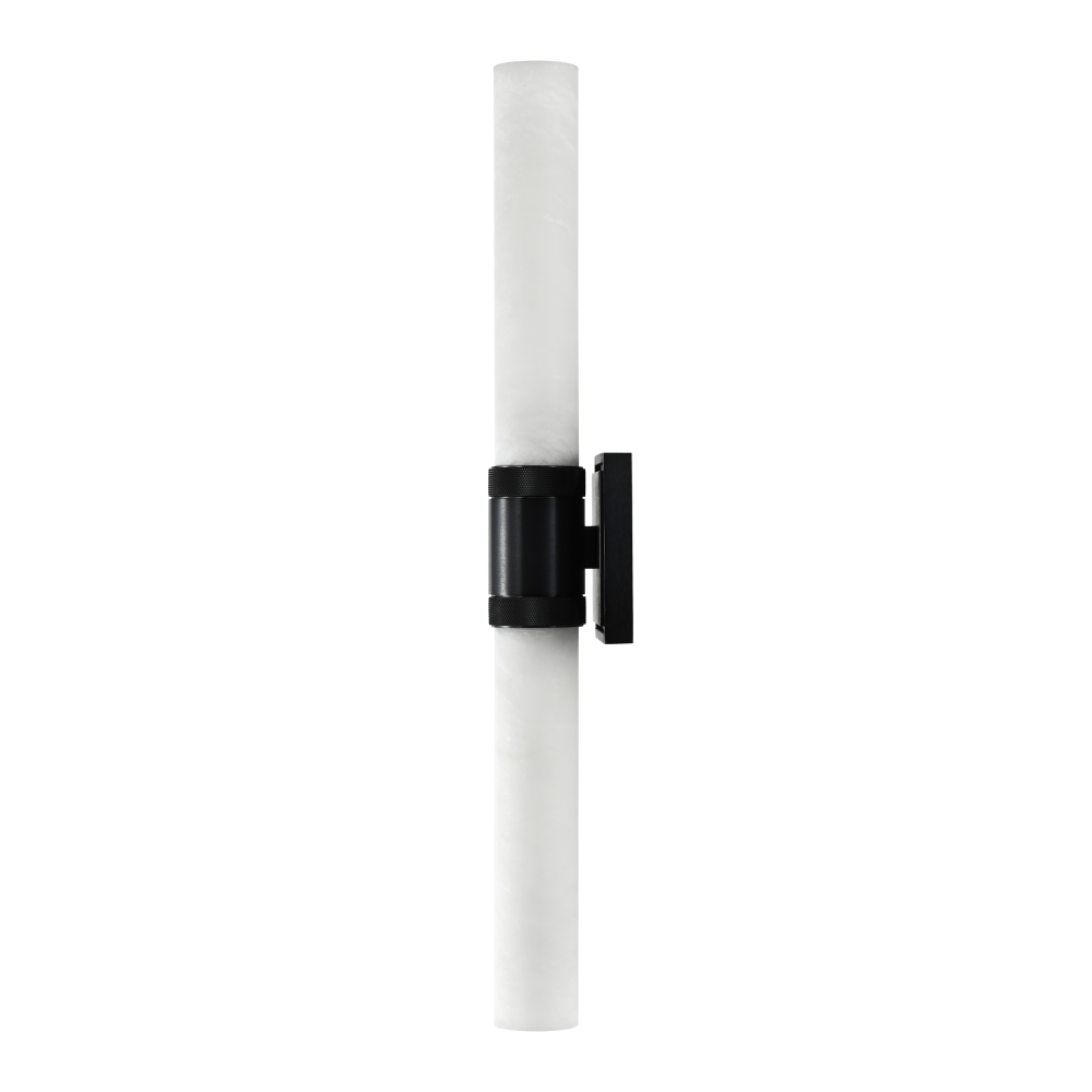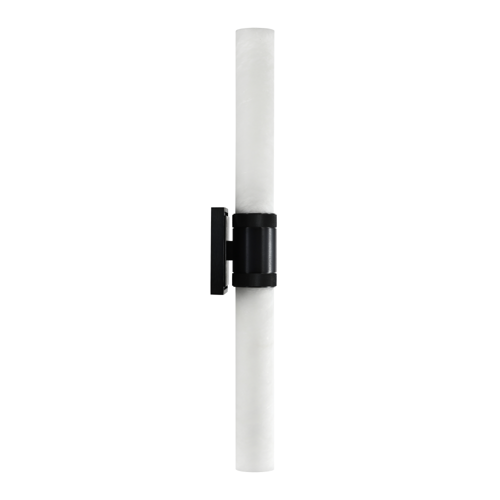 High End 2-Light Duo Wall Sconce, 12" Authentic Spanish Alabaster Shades and Our Sleek Satin Brushed Black Finish with Detailed Diamond Knurled Metal Bands. E26 Medium Base Socket for 12" T10 LED Bulb Not Included.
