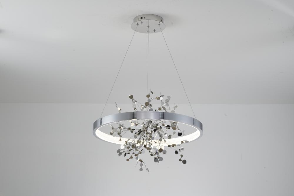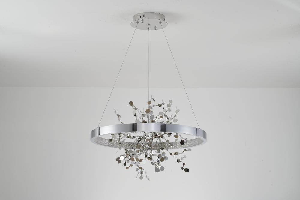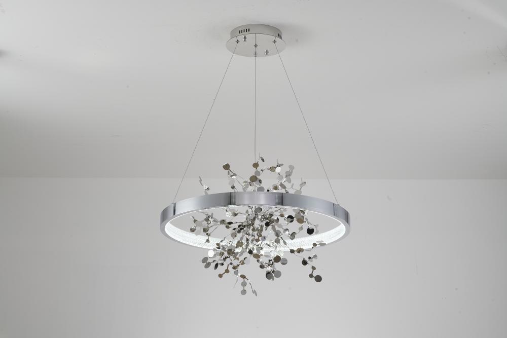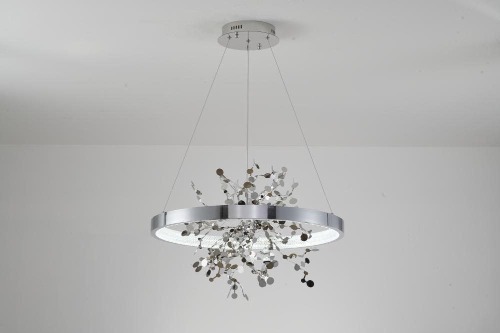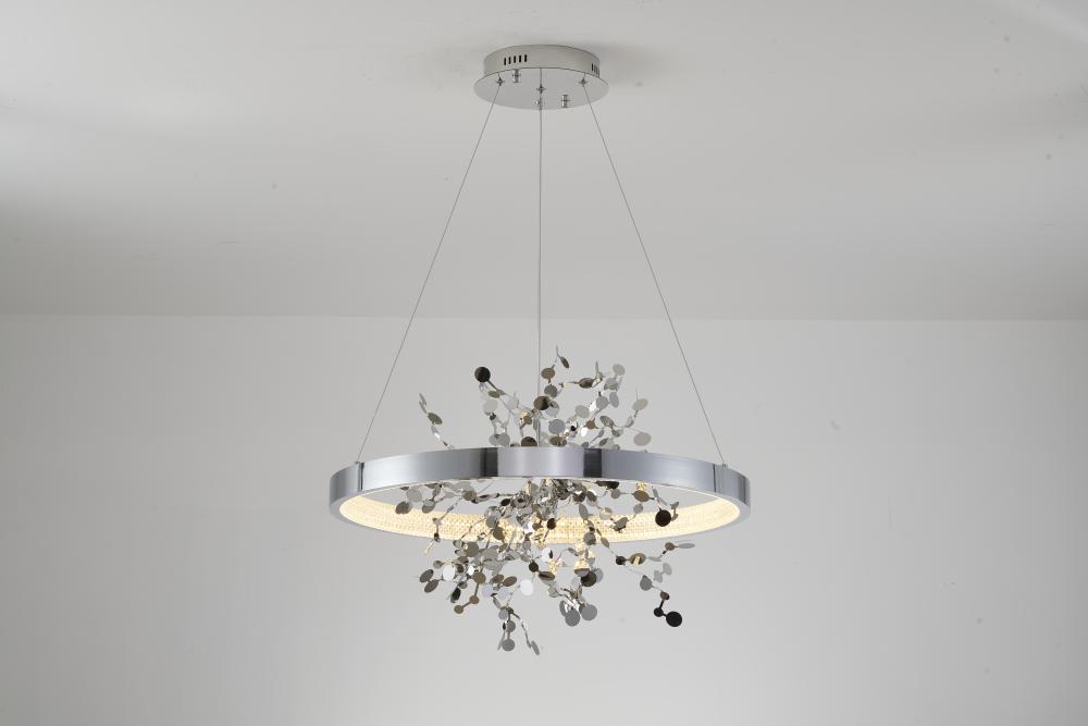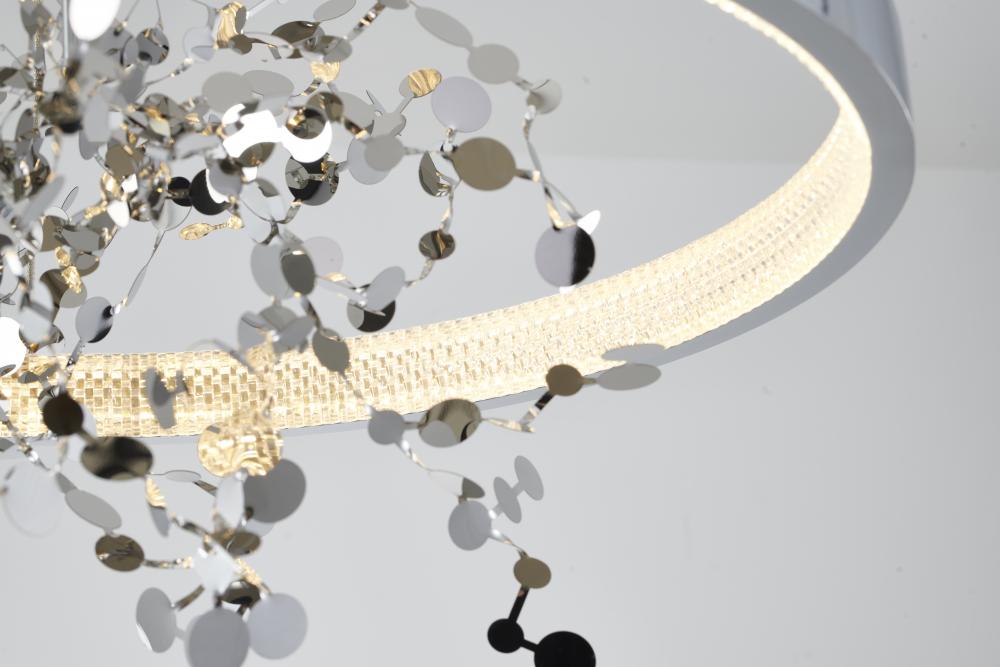 This chandelier is a chrome frame chandelier. It comes with a chrome stainless steel confetti interior and a transparent diffuser. This chandelier can change to three LED color temperatures such as 3000K, 4000K and 6000K.