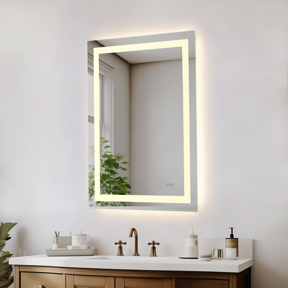 Redefine your daily routine with this ultra-modern LED mirror, designed to offer the perfect blend of style and functionality. Featuring both front and back illumination, this mirror provides a soft yet powerful glow that enhances your space with a luxurious ambiance. The adjustable color temperature (ranging from 3000K to 6400K) allows you to customize the warmth or coolness of your lighting, while the dimmable function lets you create the perfect brightness level. With a 90 CRI rating, this mirror ensures accurate color representation, making it perfect for grooming, makeup application, or daily self-care. The built-in defogger keeps your reflection clear and can be turned on or off at your convenience. Thanks to the touch sensor controls, adjusting your mirror's settings is effortless, and the memory function saves your last preferred settings for a seamless experience. Designed for versatile installation, this mirror can be hung vertically or horizontally using the included French cleats, making it a stunning and adaptable addition to any bathroom or vanity. It can be hardwired or connected to a wall switch for your convenience. Elevate your space with a mirror that not only reflects your image but also enhances your everyday routine with smart, modern lighting.
