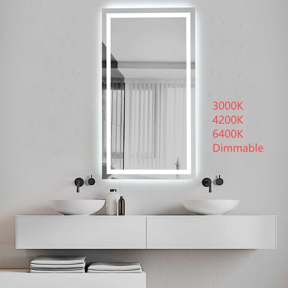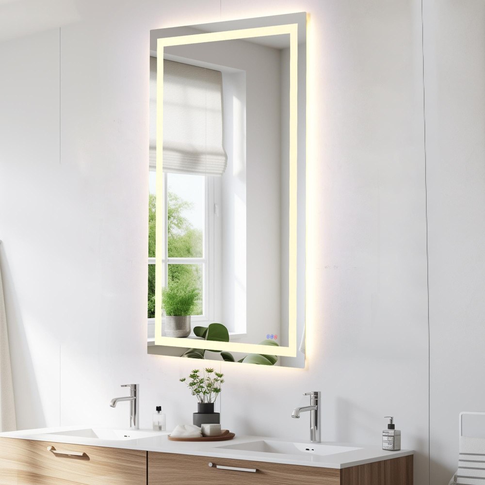 Redefine your daily routine with this ultra-modern LED mirror, designed to offer the perfect blend of style and functionality. Featuring both front and back illumination, this mirror provides a soft yet powerful glow that enhances your space with a luxurious ambiance. The adjustable color temperature (ranging from 3000K to 6400K) allows you to customize the warmth or coolness of your lighting, while the dimmable function lets you create the perfect brightness level. With a 90 CRI rating, this mirror ensures accurate color representation, making it perfect for grooming, makeup application, or daily self-care. The built-in defogger keeps your reflection clear and can be turned on or off at your convenience. Thanks to the touch sensor controls, adjusting your mirror's settings is effortless, and the memory function saves your last preferred settings for a seamless experience. Designed for versatile installation, this mirror can be hung vertically or horizontally using the included French cleats, making it a stunning and adaptable addition to any bathroom or vanity. It can be hardwired or connected to a wall switch for your convenience. Elevate your space with a mirror that not only reflects your image but also enhances your everyday routine with smart, modern lighting.