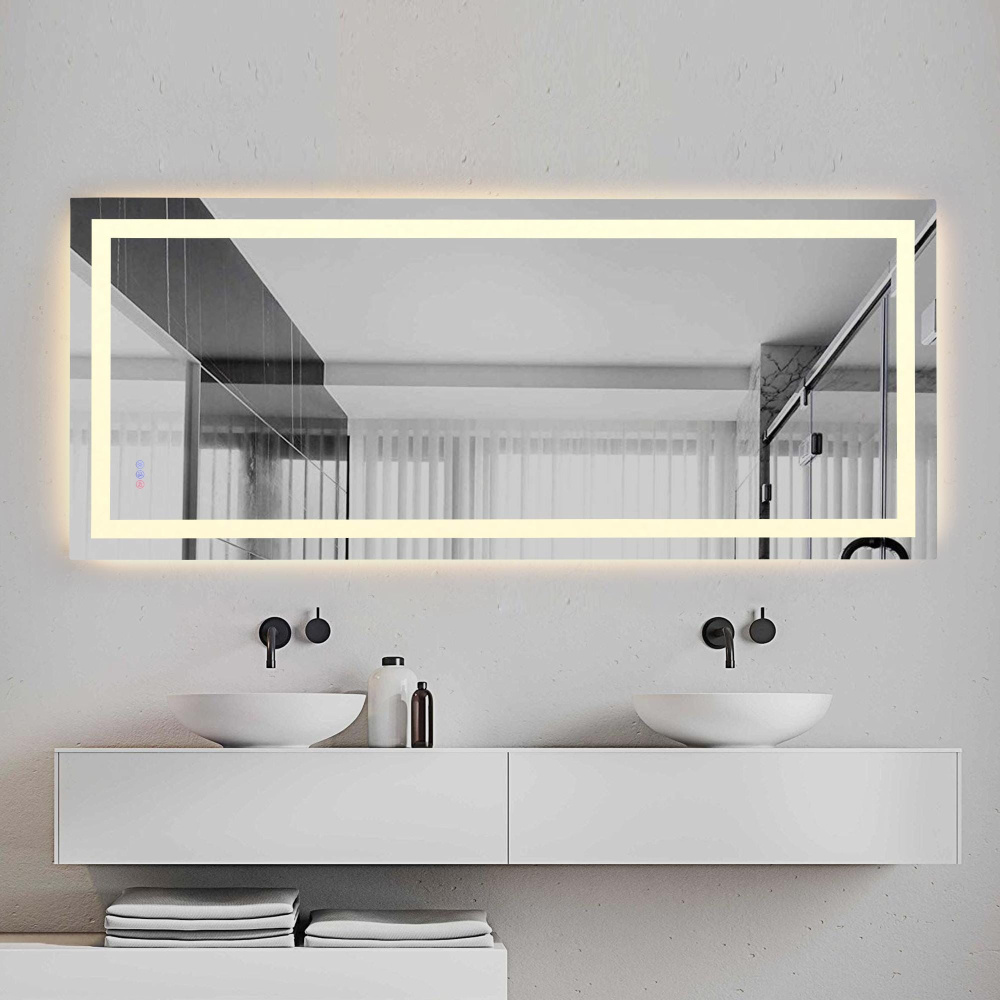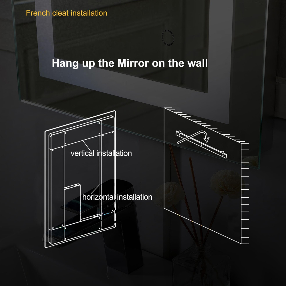 Redefine your daily routine with this ultra-modern LED mirror, designed to offer the perfect blend of style and functionality. Featuring both front and back illumination, this mirror provides a soft yet powerful glow that enhances your space with a luxurious ambiance. The adjustable color temperature (ranging from 3000K to 6400K) allows you to customize the warmth or coolness of your lighting, while the dimmable function lets you create the perfect brightness level. With a 90 CRI rating, this mirror ensures accurate color representation, making it perfect for grooming, makeup application, or daily self-care. The built-in defogger keeps your reflection clear and can be turned on or off at your convenience. Thanks to the touch sensor controls, adjusting your mirror's settings is effortless, and the memory function saves your last preferred settings for a seamless experience. Designed for versatile installation, this mirror can be hung vertically or horizontally using the included French cleats, making it a stunning and adaptable addition to any bathroom or vanity. It can be hardwired or connected to a wall switch for your convenience. Elevate your space with a mirror that not only reflects your image but also enhances your everyday routine with smart, modern lighting.