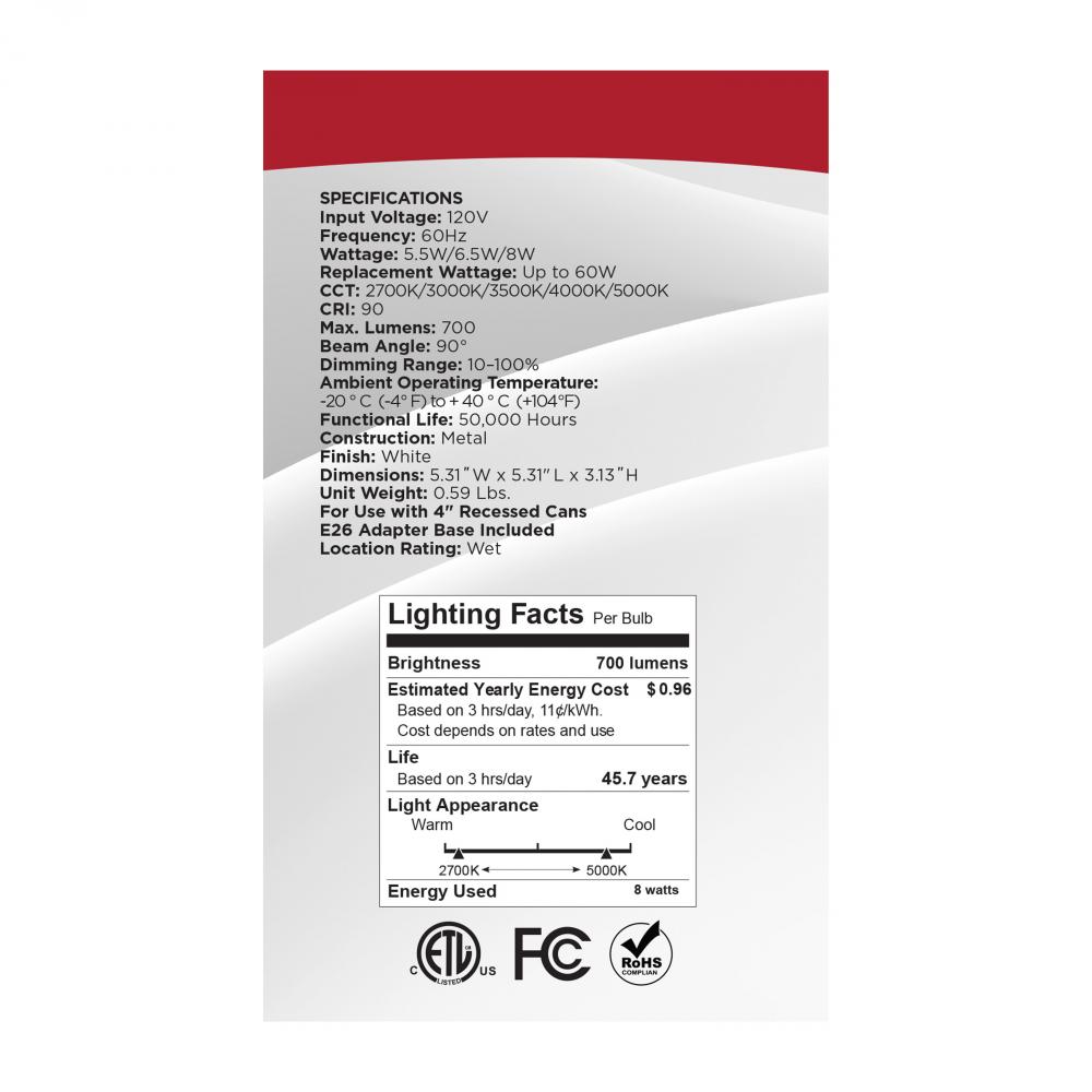 LED Retrofit Downlight; 5.5/6.5/8 Wattage Selectable; CCT and Lumens Selectable; 120 Volt;