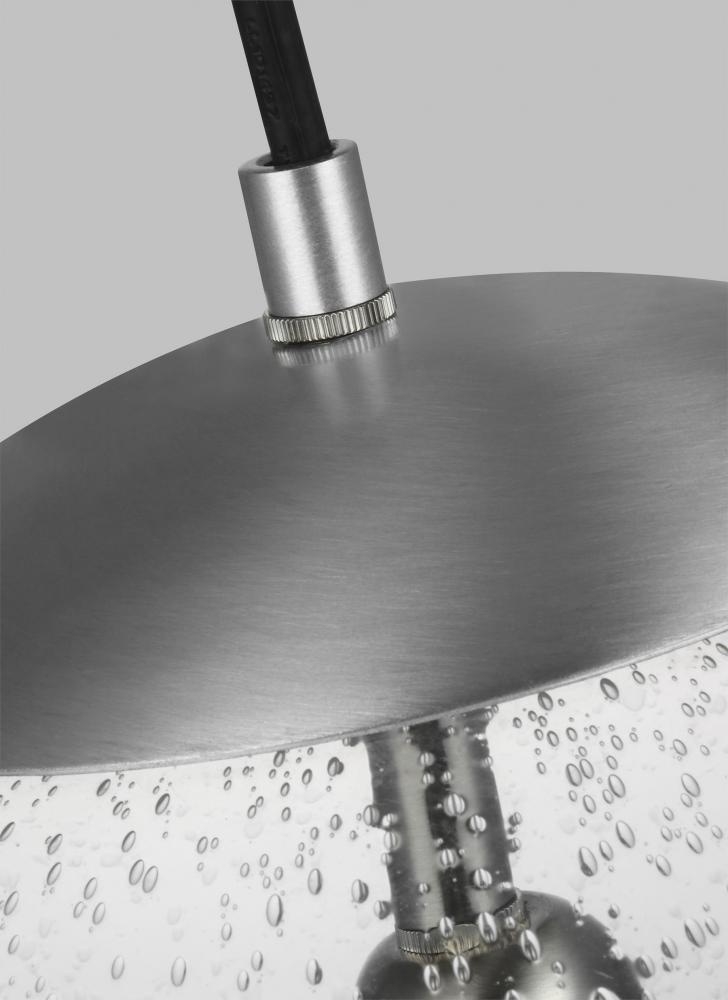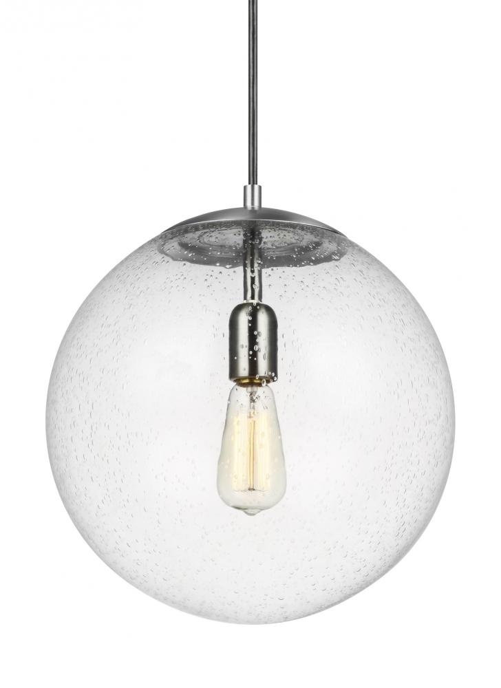 The Leo - Hanging Globe one light indoor pendant in satin aluminum provides abundant light to your home, while adding style and interest. While hanging globes are one of lighting's hottest trends, Sea Gull's timeless Leo Collection has been around for 50 years! Constantly evolving with the times, these classic pendants are now offered with NEW Clear Seeded glass and in Satin Aluminum finish. Adjustable cloth cords allow for unlimited variations of hanging heights. All glass softly diffuse the light, each fixture comes with 54†of cuttable cord to customize the installation exactly to your needs. Easily convert every piece in the collection to LED by purchasing LED replacement lamps sold separately. All fixtures are qualified and California Title 24 compliant and damp rated for use in sheltered, damp environments like bathrooms, covered patios or porches.