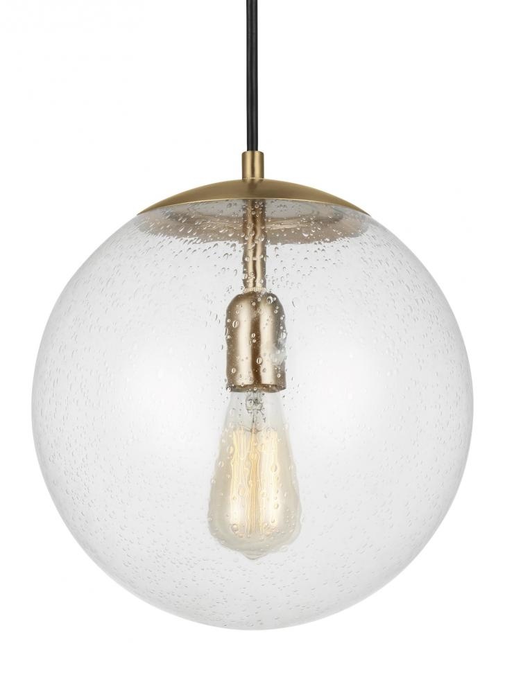 The Leo - Hanging Globe one light indoor pendant in satin brass enhances the beauty of your home with ample light and style to match today's trends. While hanging globes are one of lighting's hottest trends, Sea Gull's timeless Leo Collection has been around for 50 years! Constantly evolving with the times, these classic pendants are now offered with NEW Clear Seeded glass and in Satin Aluminum finish. Adjustable cloth cords allow for unlimited variations of hanging heights. All glass softly diffuse the light, each fixture comes with 54†of cuttable cord to customize the installation exactly to your needs. Easily convert every piece in the collection to LED by purchasing LED replacement lamps sold separately. All fixtures are qualified and California Title 24 compliant and damp rated for use in sheltered, damp environments like bathrooms, covered patios or porches.