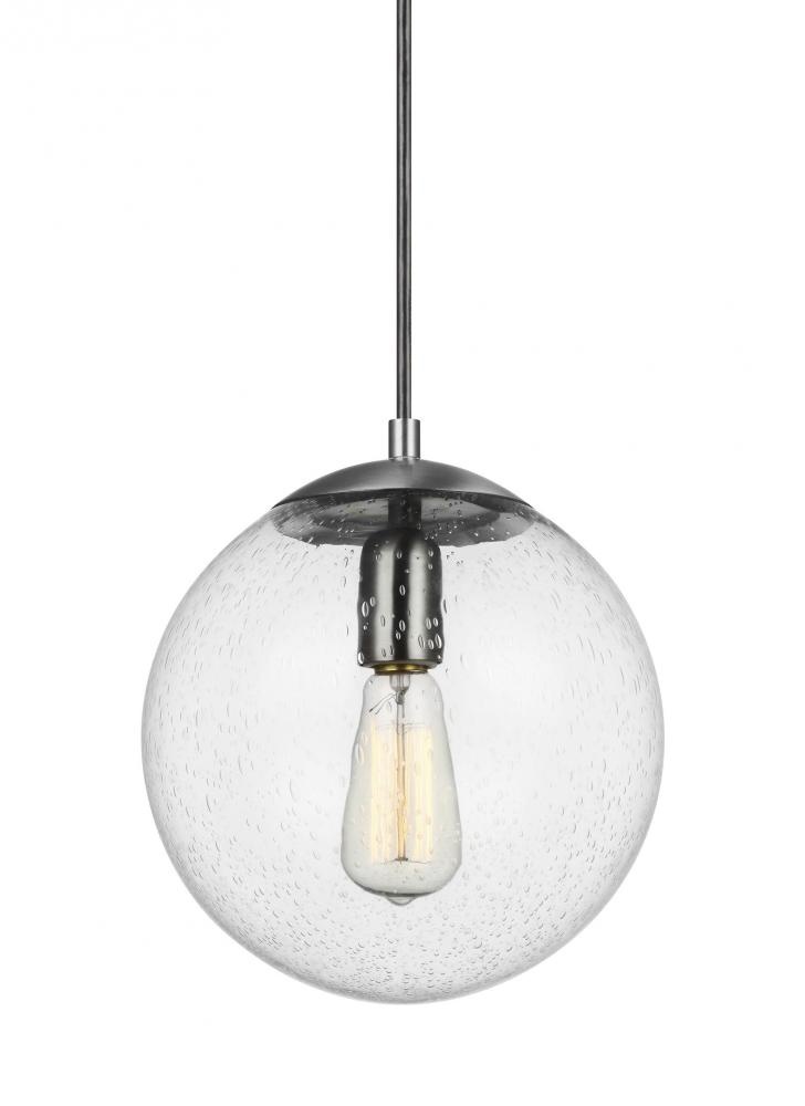 The Leo - Hanging Globe one light indoor pendant in satin aluminum is the perfect way to achieve your desired fashion or functional needs in your home. While hanging globes are one of lighting's hottest trends, Sea Gull's timeless Leo Collection has been around for 50 years! Constantly evolving with the times, these classic pendants are now offered with NEW Clear Seeded glass and in Satin Aluminum finish. Adjustable cloth cords allow for unlimited variations of hanging heights. All glass softly diffuse the light, each fixture comes with 54†of cuttable cord to customize the installation exactly to your needs. Easily convert every piece in the collection to LED by purchasing LED replacement lamps sold separately. All fixtures are qualified and California Title 24 compliant and damp rated for use in sheltered, damp environments like bathrooms, covered patios or porches.