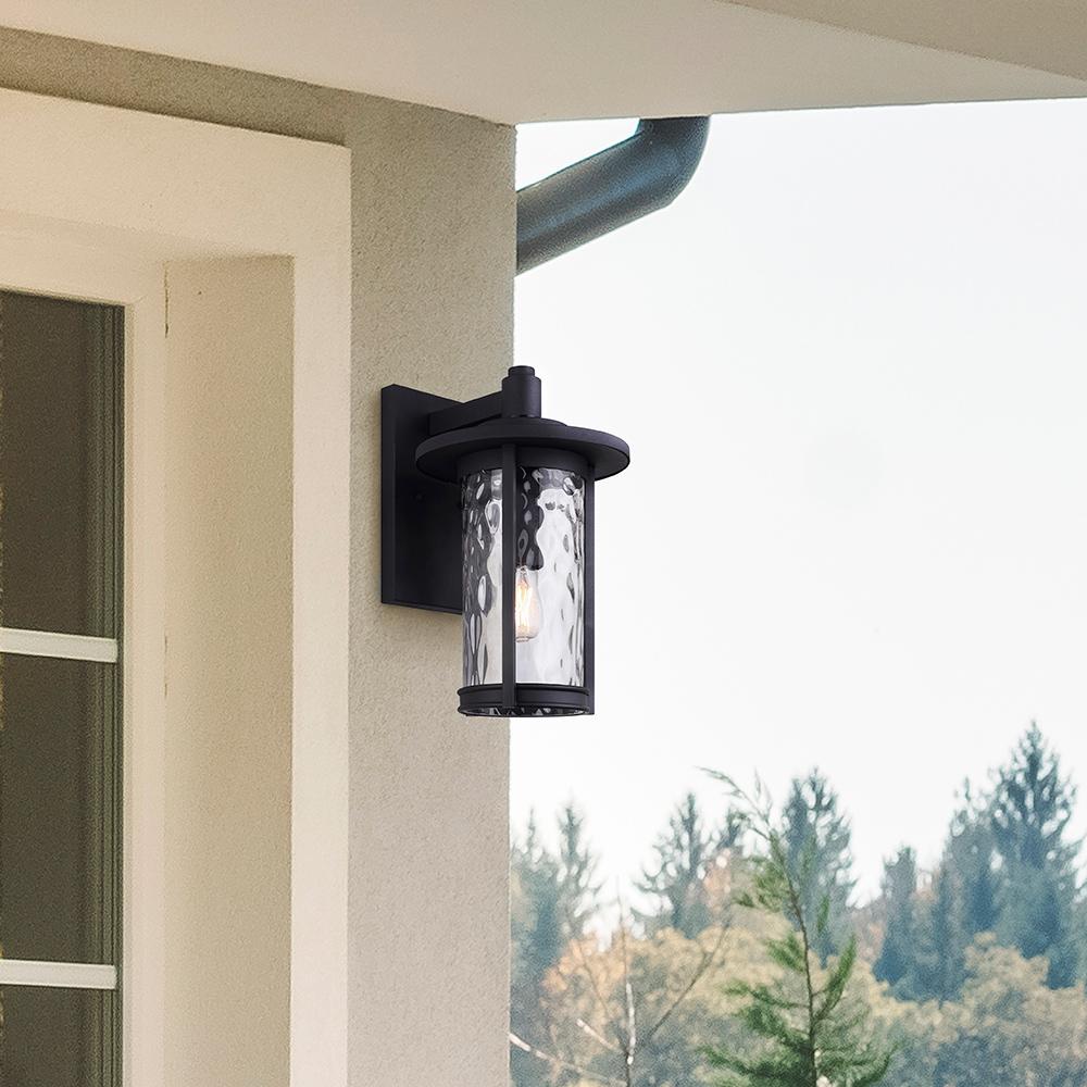 The LEON IOL567BK is a one-light outdoor down light in Black (Sand) with watermark glass. It includes a B-LST45-4 bulb and measures 9.5 inches wide, 14.5 inches high, and 11.375 inches deep. Easy Connect included, this fixture is ideal for enhancing outdoor ambiance and safety.