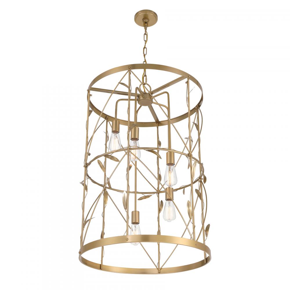 Drawing inspiration from the beauty of nature, this Savoy House Lexington 5-light lantern has a wide and tall cylindrical structure decorated like a trellis with leaf-topped vines. It is finished in Burnished Brass for a glamorous touch. Lexington is 37" in height and 26" in width. Uses five standard size bulbs of up to 60 watts per bulb. Bulbs not included.