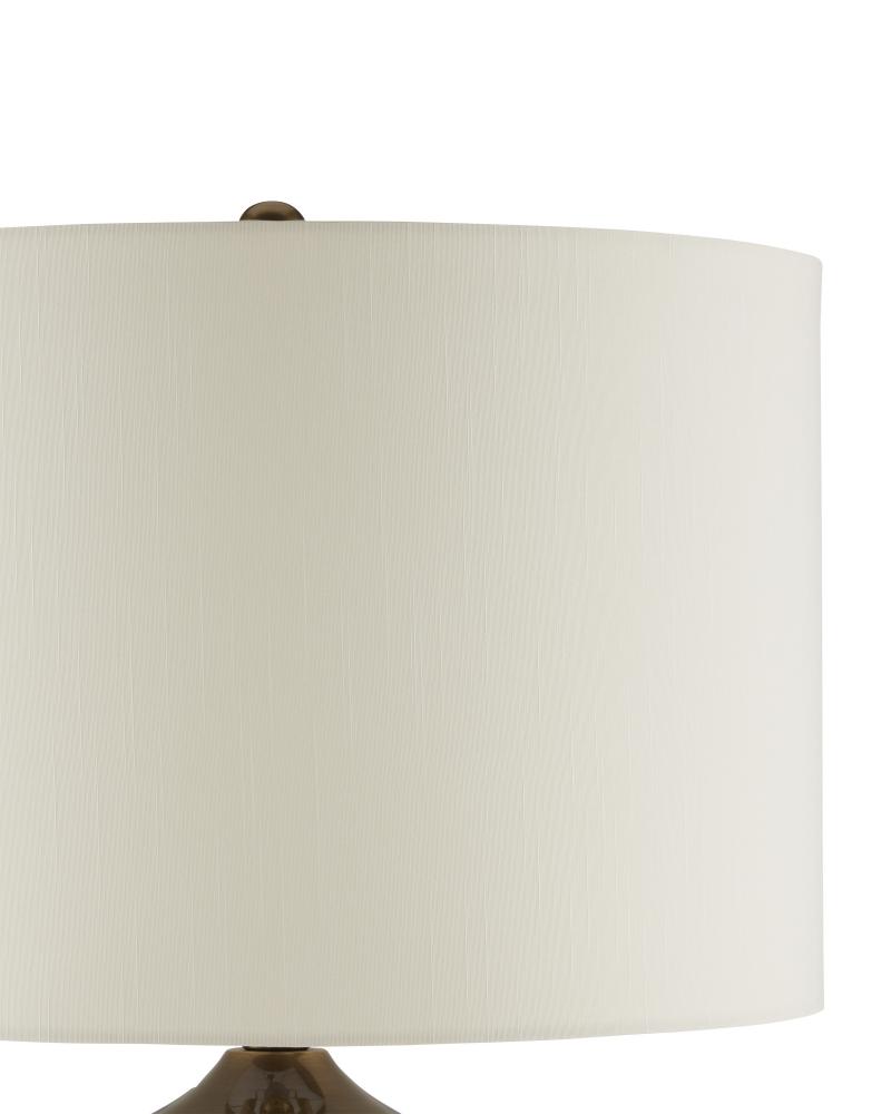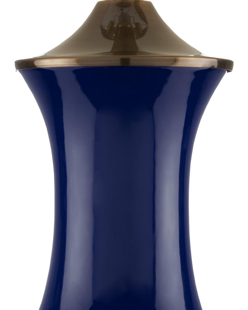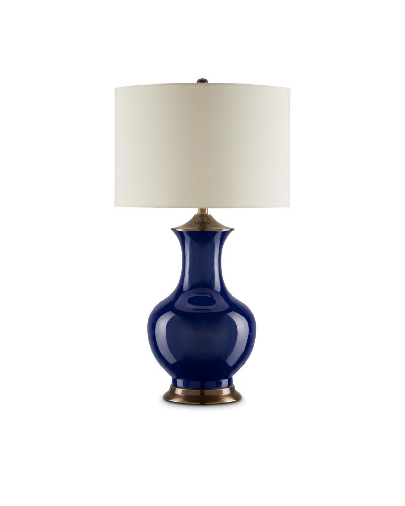 Serenity has a profile in the Lilou Blue Table Lamp with its lovely vase-like profile. Made of porcelain, the blue surface has a luster to it for which this time-honored material is known. The depth of the blue is luscious even though it's cool. This is complemented by the metal hardware and base in an antique brass finish. A light element to the composition is the eggshell shantung drum shade, which is fastened in place with an antique brass finial. The Lilou is one of our most popular designs.