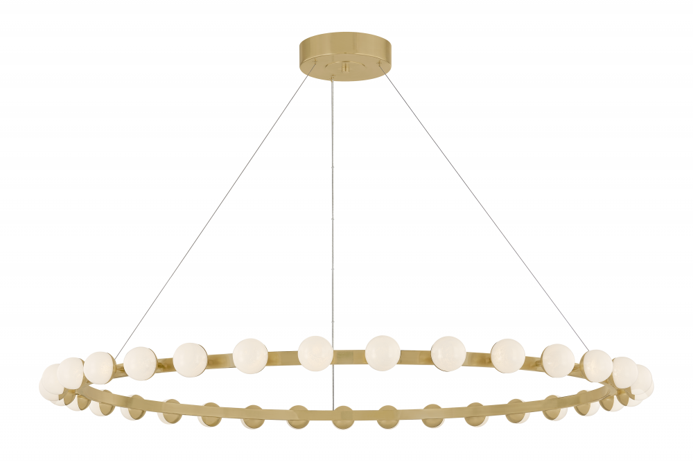 Elements of repetition and scale are skillfully balanced in the Linus chandelier to create a striking visual impact. Finished in Vintage Brass, the concentric rings that form the framework support a series of globes. Marked by a unique, crackled effect, the antique quality of the White Luna glass adds an air of artistry. What sets this family apart is its versatility: despite the five distinct options, only three rings are used to create an array of configurations.