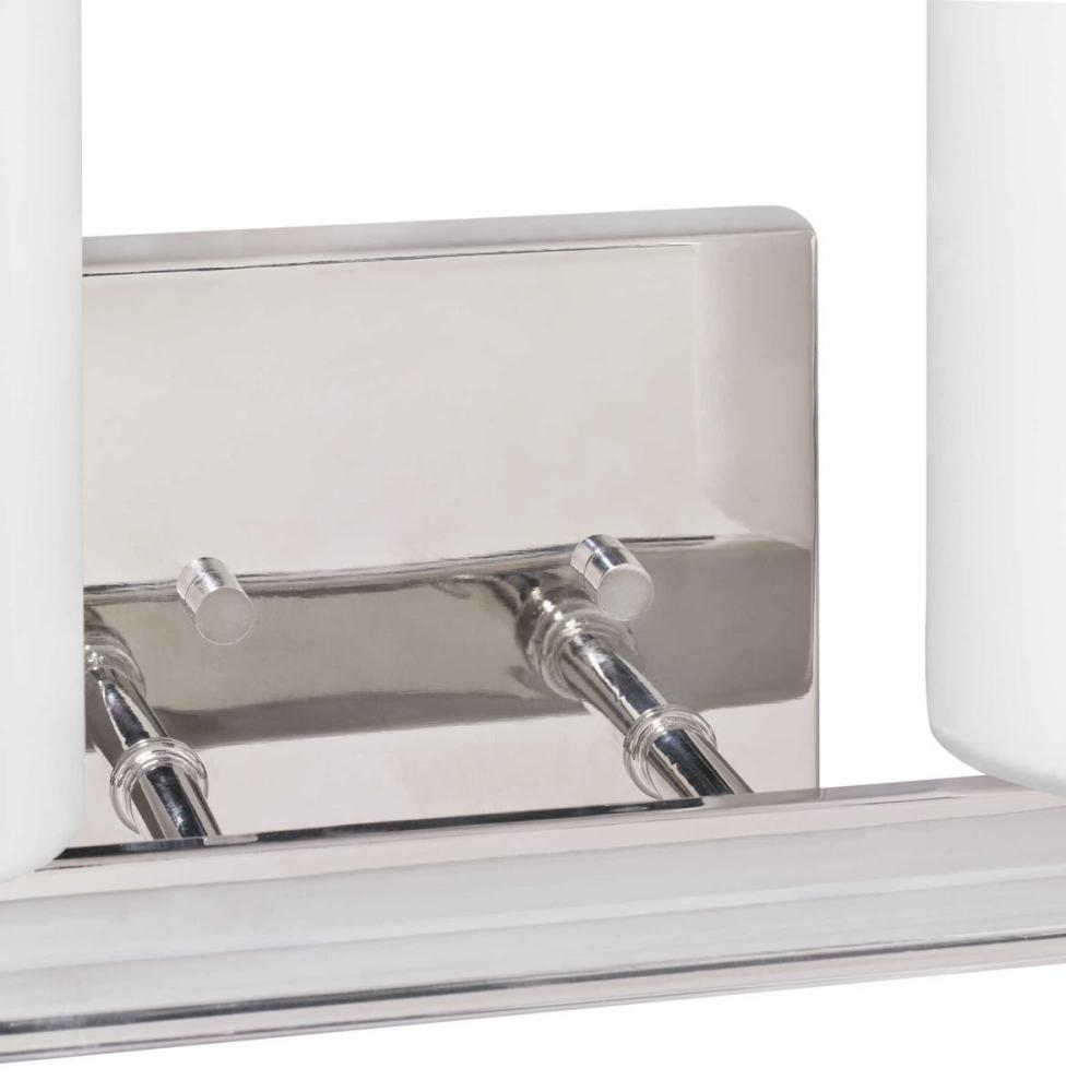 Enjoy high status with a four-light bath and vanity in the Lisbon Collection that is full of femininity, gleam and shine. Etched opal glass shades sit atop an elegant K9 glass rod, highlighted with a Polished Nickel finish. The highly polished design style complements both Modern and Luxe interiors – and can be mounted up or down.