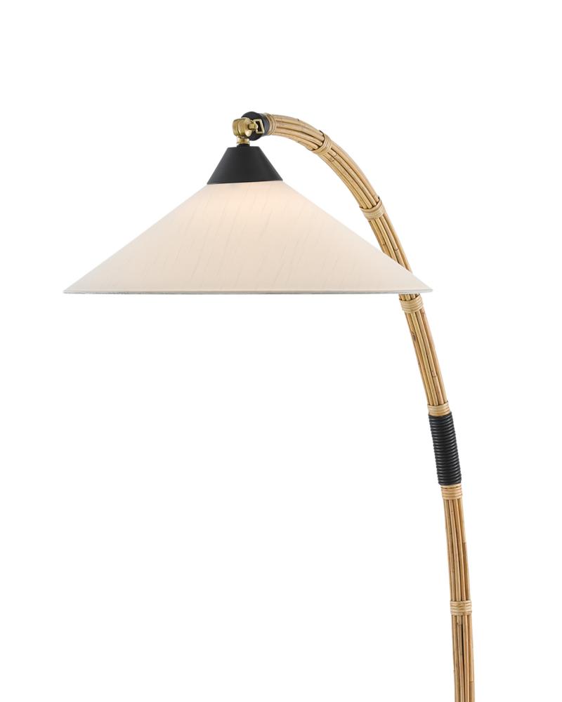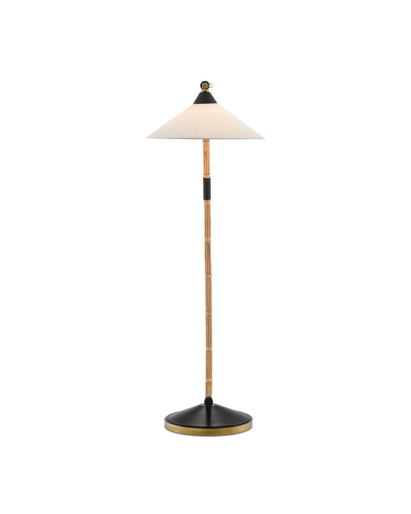 A nod to one of the world's seafaring port cities, our Lisbon Floor Lamp, which is made of wrought iron in new brass and satin black finishes, has a stem covered in rattan to bring a nautical feel to its character. Several design notes worth mentioning on this rattan floor lamp are the curvature of the stem that has several sections wrapped horizontally in black, the shape of and details on the off-white linen shade, and the black finish at the top of the base.