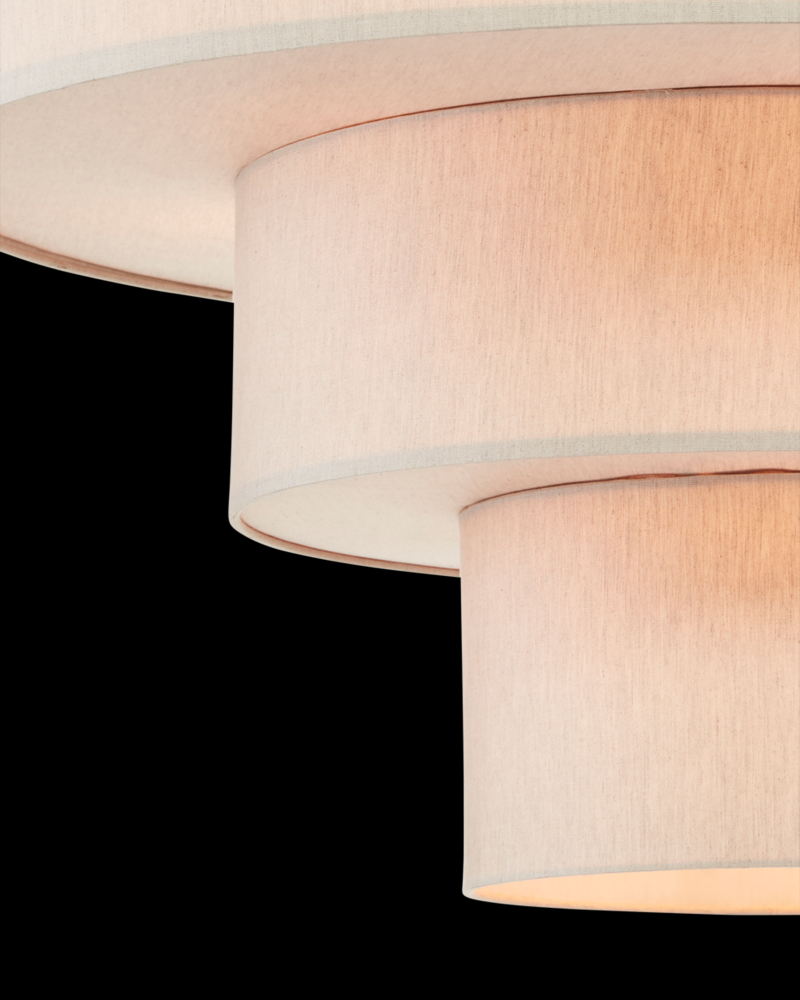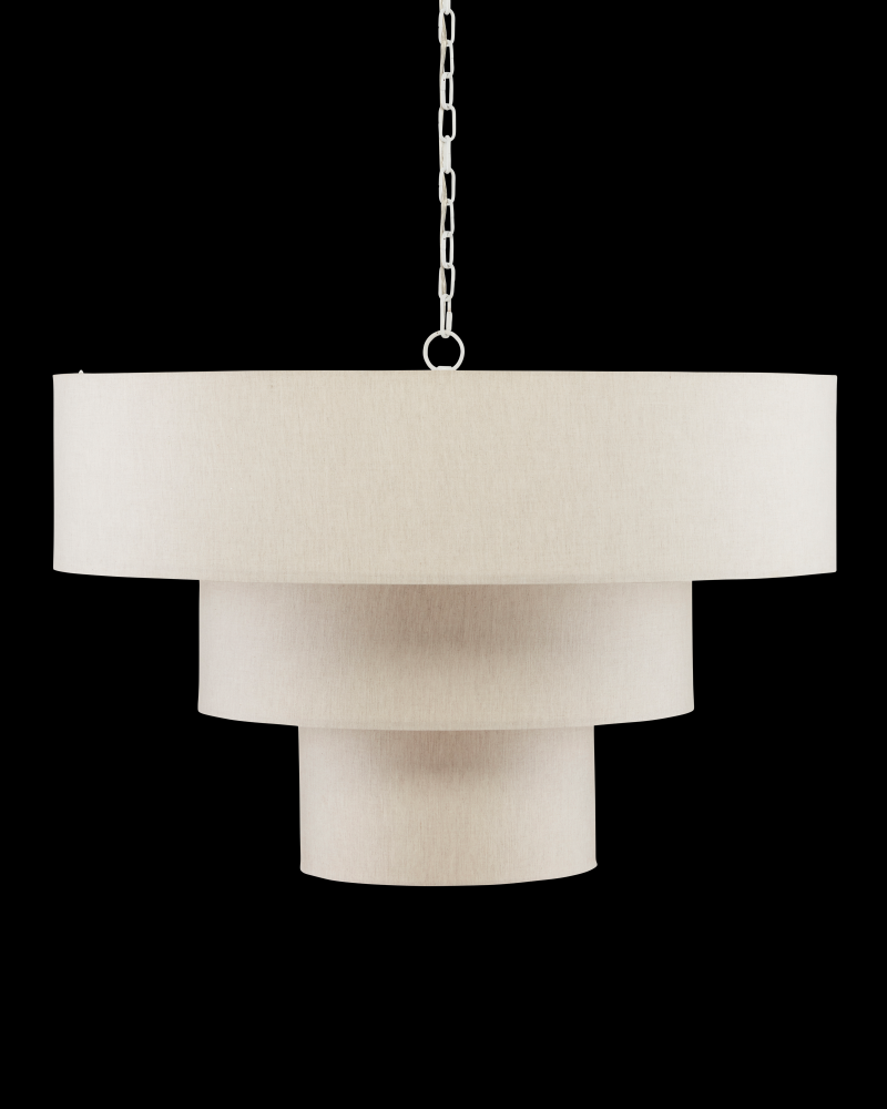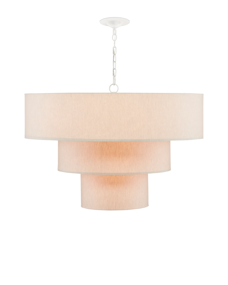 The Livello Chandelier has tiers of linen-weave shades that graduate from large to small, a shape that calls to mind an inverted wedding cake. The triple-drum chandelier is closed at the bottoms with diffusers to soften the light, and the glossy white finish on the metal keeps the composition airy. Adjustable from 28" to 100" with use of included chain/rod kit/cable. If your space calls for a longer drop, additional chain/rods/cable is available for purchase.