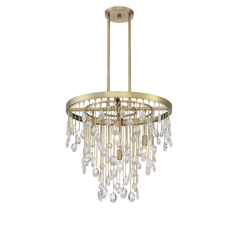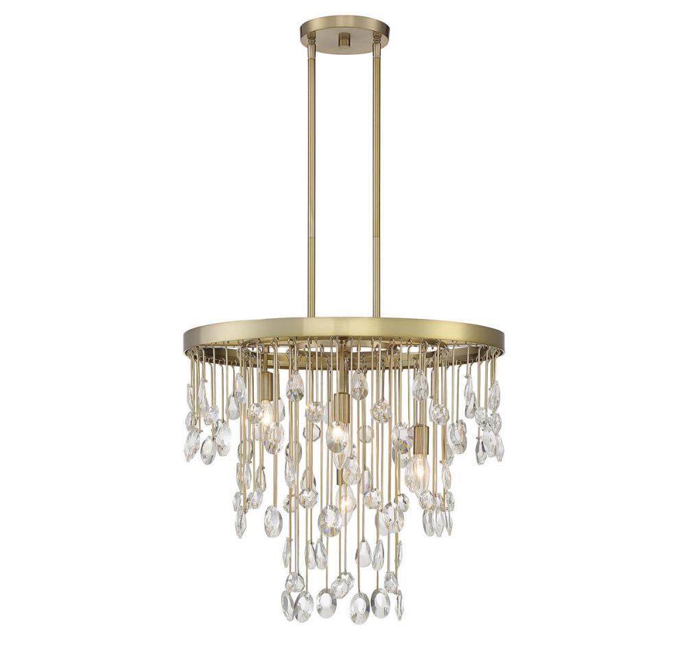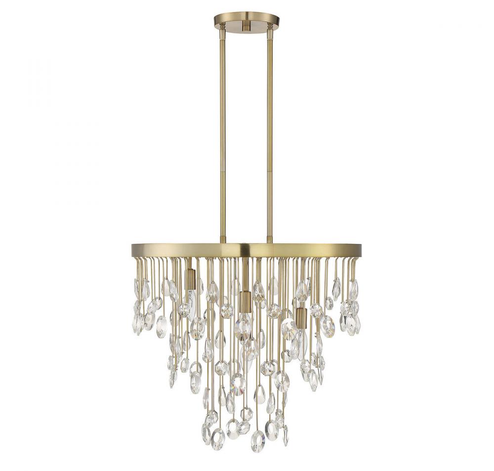 If you are looking for lighting that makes a big style statement, look no further than this Savoy House Livorno 4-light pendant. Every aspect of Livorno is thoughtfully designed to create the biggest impact, from the lights that hang at different heights to the 3 tiers of beautifully faceted crystals in different shapes and sizes. This is the perfect way to indulge your craving for updated Hollywood Regency glamour in any room, including foyers, living rooms, kitchens and bedrooms. Finished in Noble Brass. This fixture is 21" wide and has an adjustable height that ranges from 25" to 71". Uses 4 candelabra size bulbs of up to 60 watts each (not included).