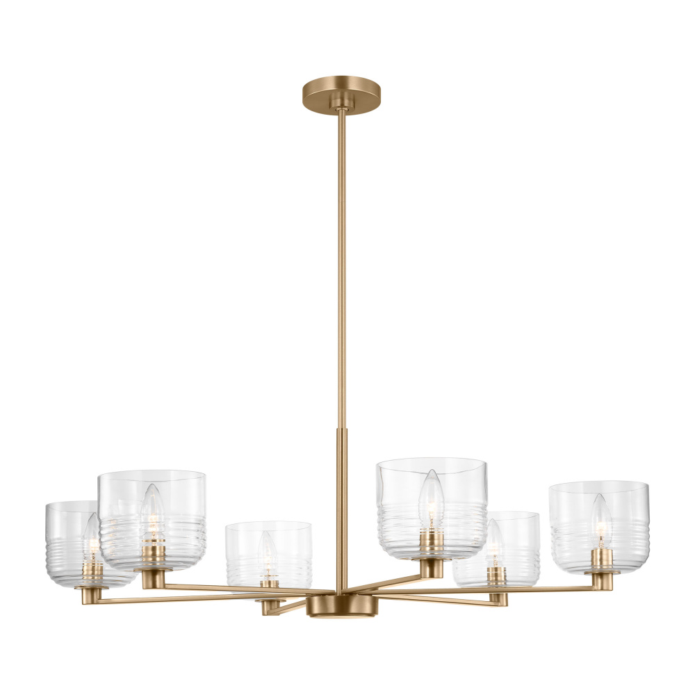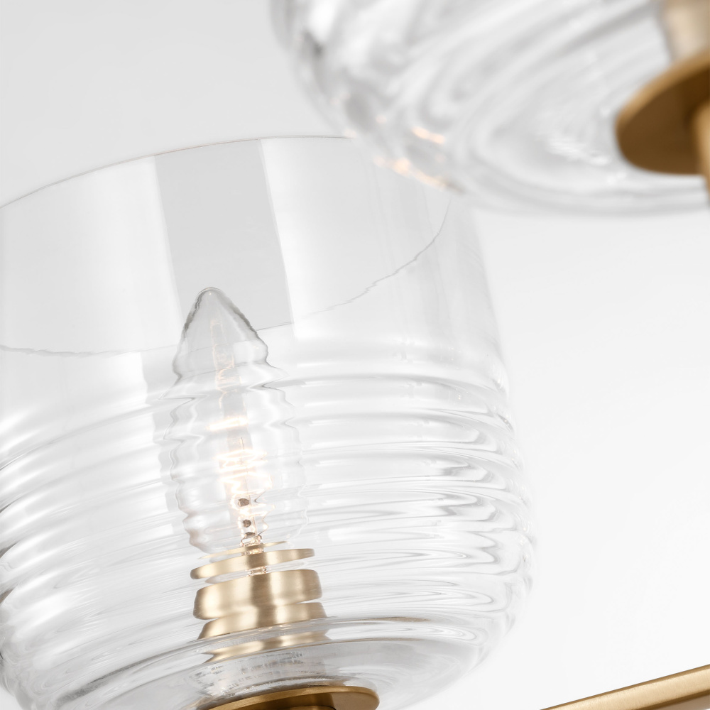 Crafted with Steel in a Satin Brass finish with clear ribbed glass shades