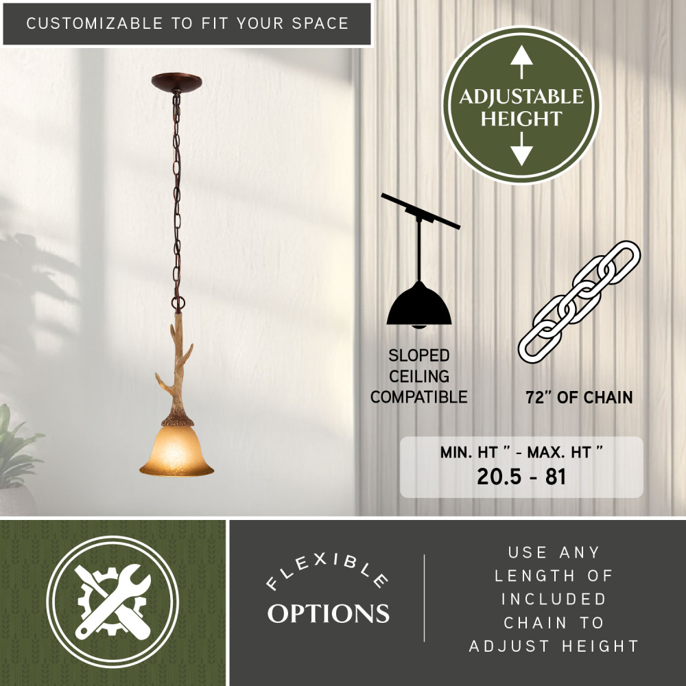 Bring a little nature indoors with the Lodge collection. Its wild look is warm and inviting yet interesting and stylish. The fixtures are designed to replicate the textural elements of pine tree bark and wood. The sculpted antlers are realistically detailed. French scavo glass shades complete the look. Everything combined makes this collection a great choice for a rustic vacation lodge, cabin or a suburban home. It will complement a variety of home styles: anywhere you want to bring in an element of nature. Install this mini pendant individually or in a group; ideal for kitchens, dining areas, or bar areas.
