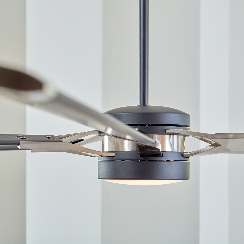 The Sean Lavin Loft 96 LED in Midnight Black features a 125.0 X 25.0 6 speed motor with a Thirteen degree blade pitch. With a unique split blade iron design, two-tone finish combinations and extruded aluminum blades, Loft is ideal for modern homes and commercial environments. The large-scale 96” fan has a powerful DC motor that uses minimal electricity and a bright white energy-saving LED downlight. Circulate air and create a strong ambient light base in your projects with Loft by Sean Lavin.