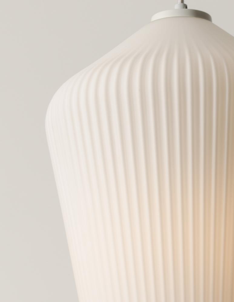Contemporary LED pendant with soft hand-blown ribbed glass diffuser. Suspended by a 9 ft. adjustable cord with metal monopoint canopy. Hang Individually or in clusters for a bold statement. Medium base socket for multiple lamping options.