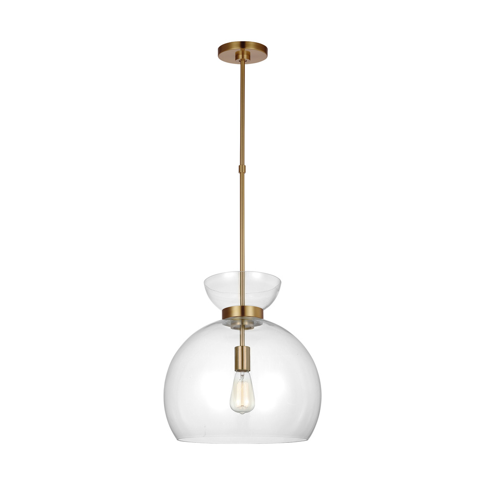 Londyn is inspired by geometric playful midcentury fixtures in metal and glass with exciting profiles and scale play. Two glass spheres with a simple metal cuff and a single bulb—an elegant pendant with graphic interest. This pendant would be great as a single or in multiples over a kitchen island.