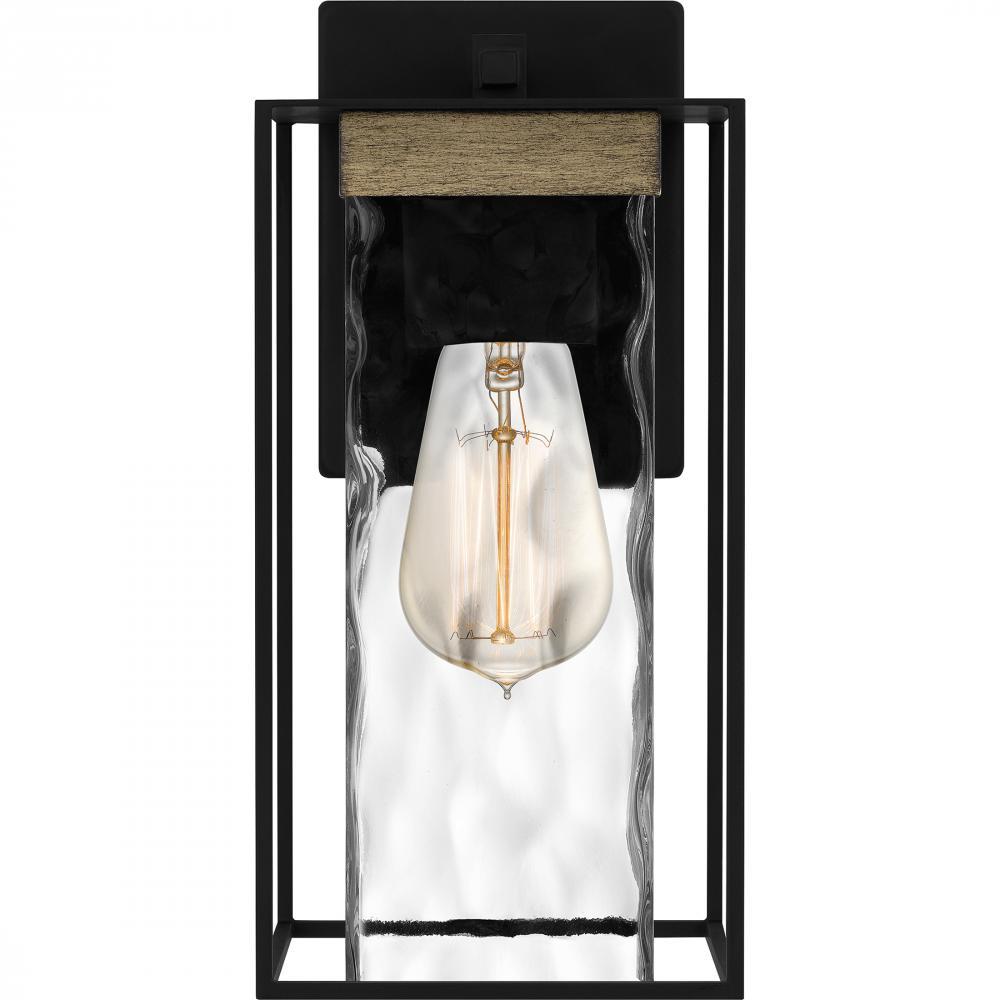 Clear hammered glass adds major visual intrigue in the Longwood lantern collection. This outdoor sconce shines brilliantly with its sturdy rectangular frame, uniquely textured glass shade, and wood accents. A matte black finish completes the look and creat