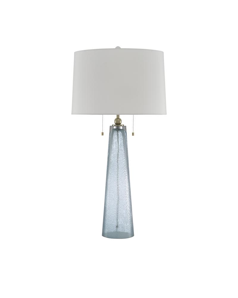 Pale blue seeded glass makes our Looke Table Lamp luminous. The material has been blown into a tall, slim column that telescopes downward. Metal hardware and pull-chains are in a brass finish, and the slender pale blue table lamp is topped with an off-white shantung drum shade.