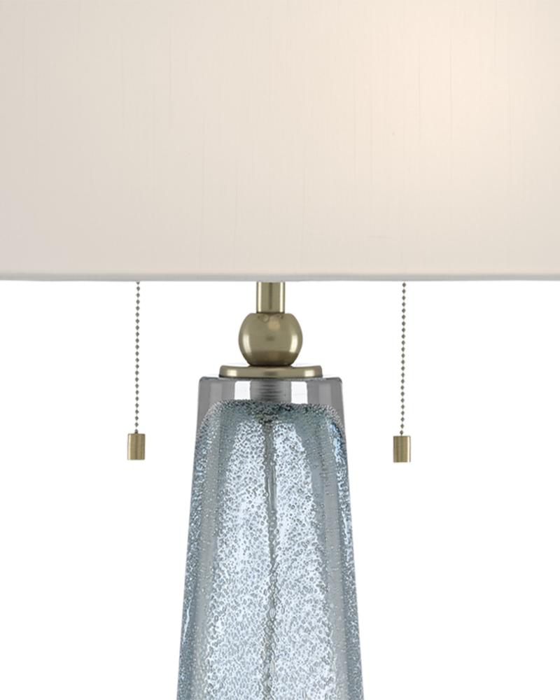 The bubbly surface of pale blue seeded glass is only one facet of our Looke Table Lamp’s appeal. The fact that the material has been blown into a tall, slim column that telescopes downward is its most personable attribute. We treated the metal hardware and pull-chains to a brass finish and topped this slender beauty with an off-white shantung drum shade.