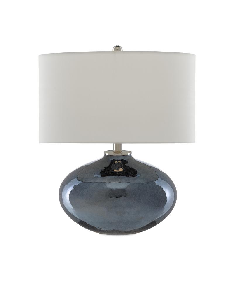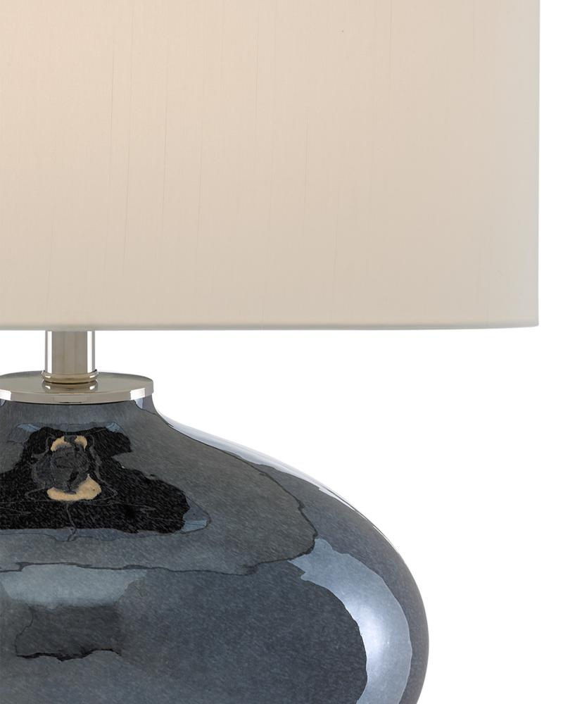 In the tried-and-true tradition of radiant mercury glass, our Lucent Blue Table Lamp shines like few materials can. The rotund body made of luminous blue plated glass effervesces when light wafts from under the off-white shantung shade, held in place by hardware and a round finial in a polished nickel finish. This is one of our products that illustrates the skill of our glassblowers and finishers.