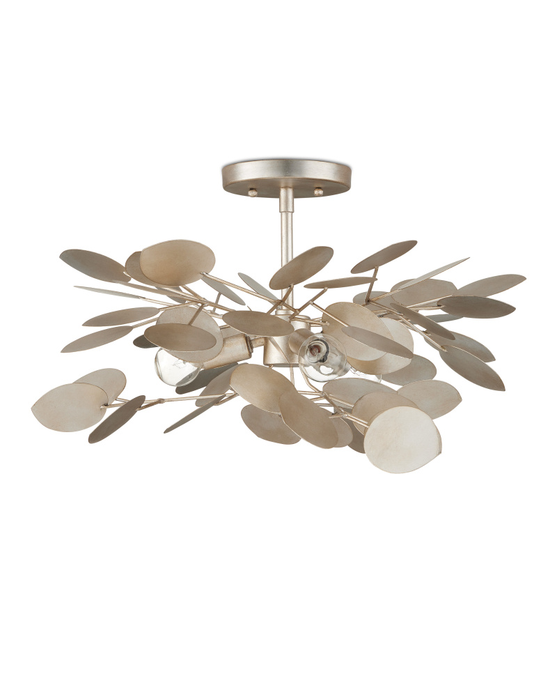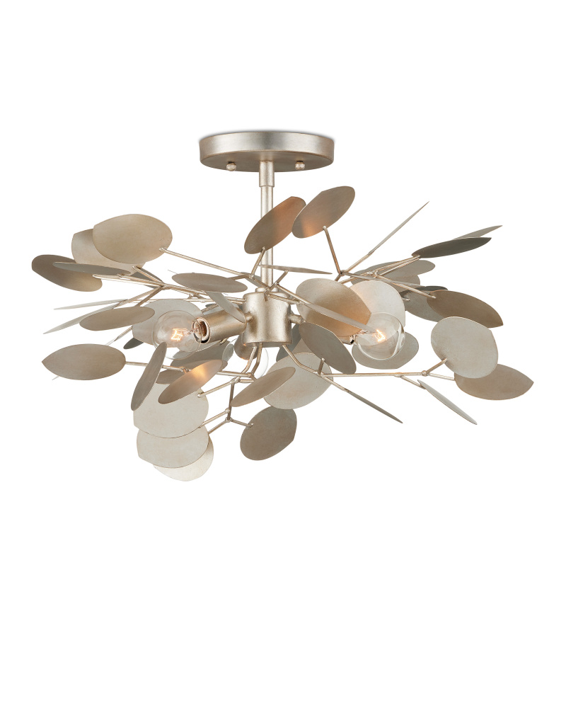 With a lyrical profile of fluttering discs that favor the leaves of its namesake plant, the Lunaria Semi-Flush Mount is made of wrought iron in a contemporary silver leaf finish. The light from the bulbs that illuminate the flowing petals of metal reflect off the finish on this fixture to increase the glow. The nature-inspired creation will add elemental style to a space.