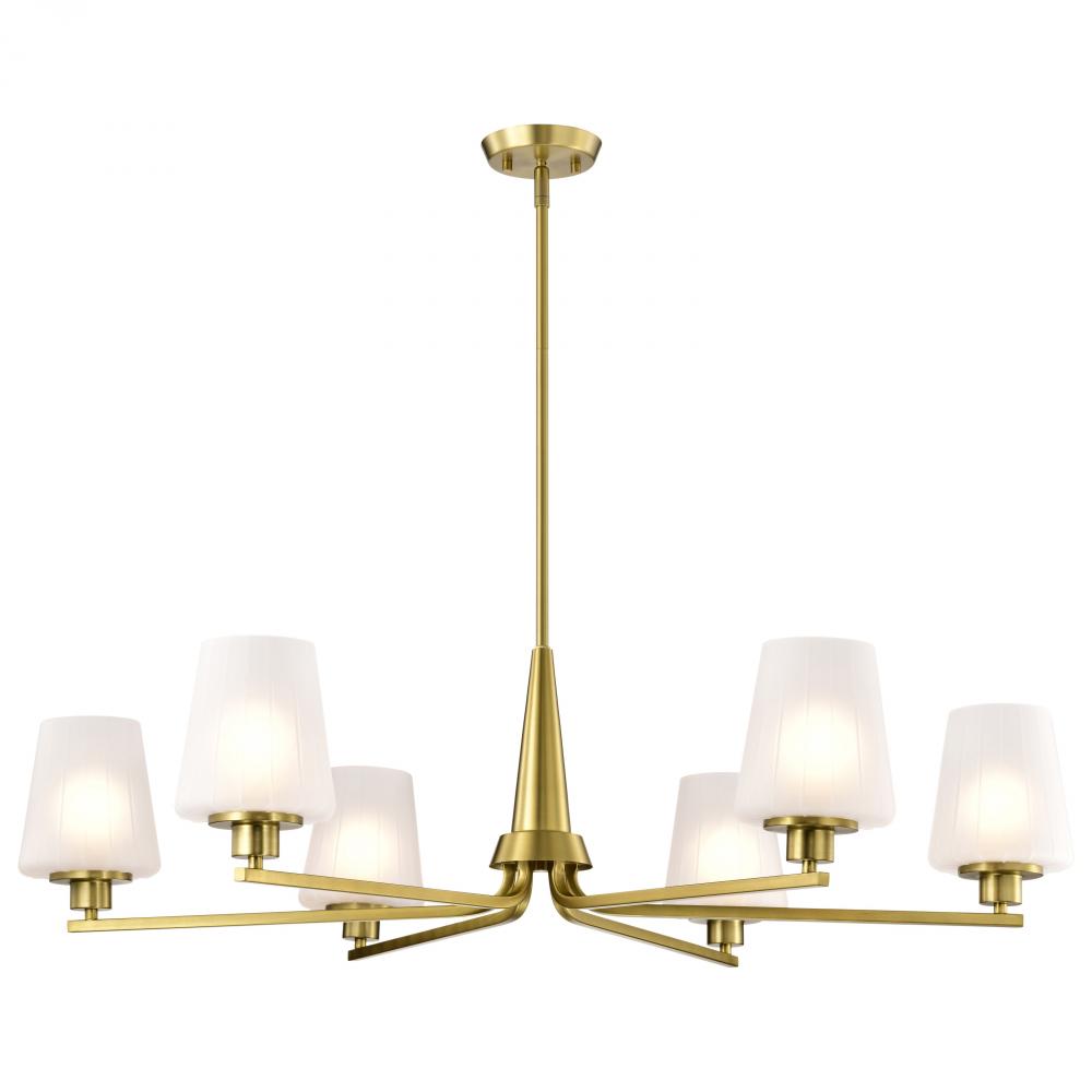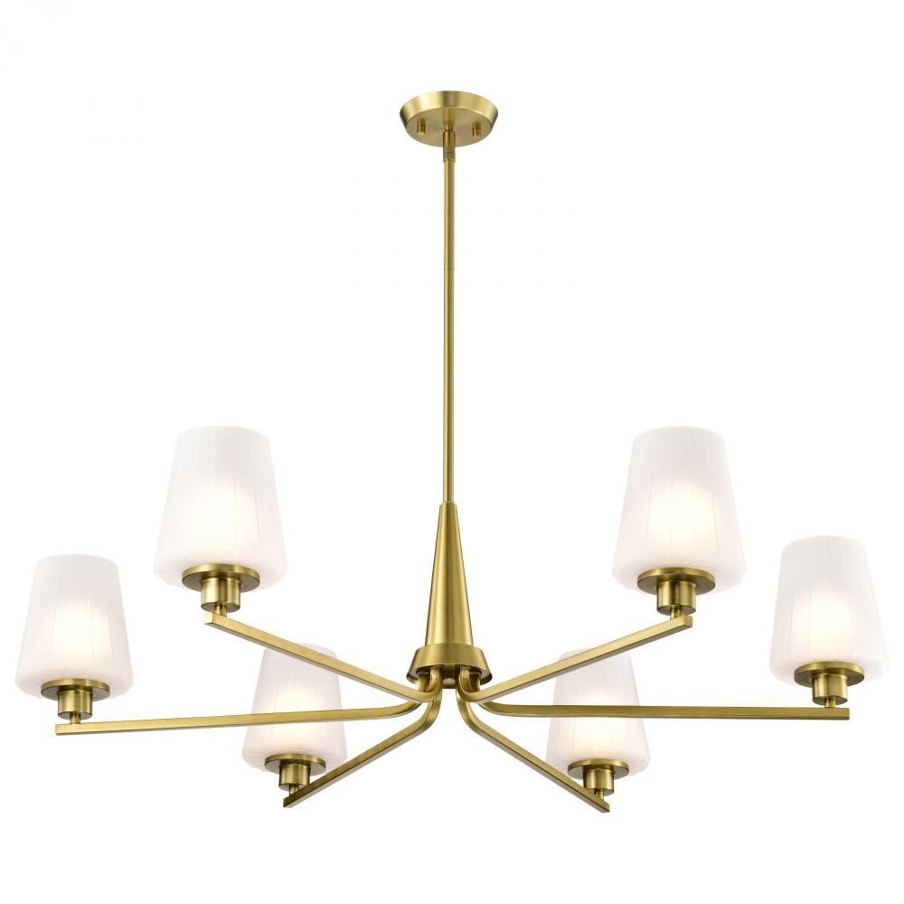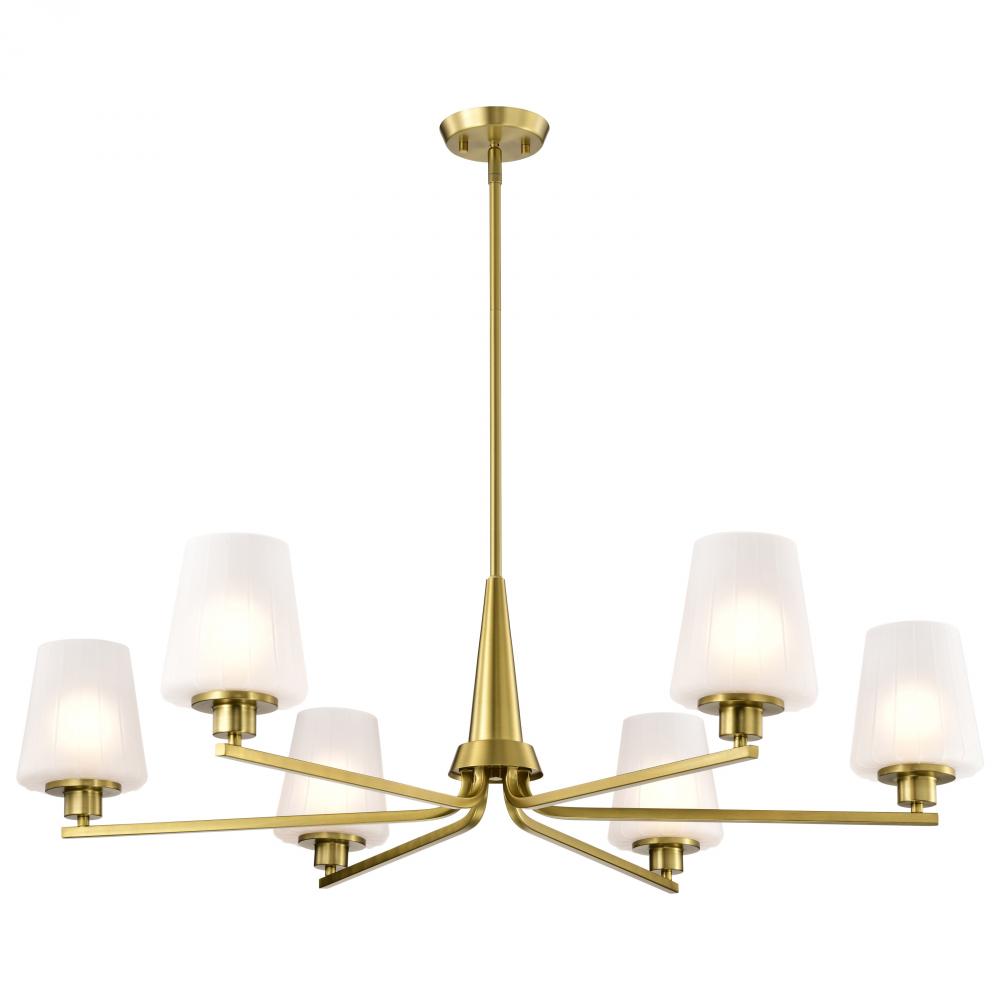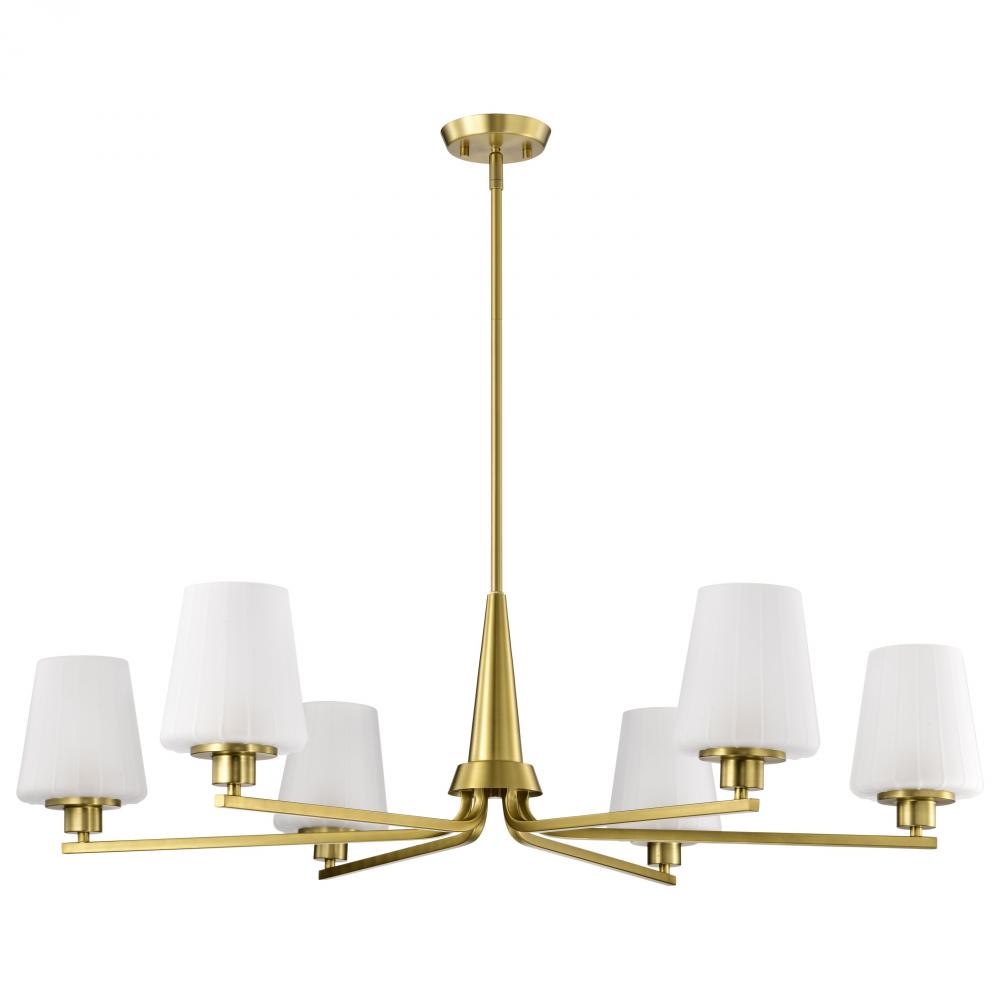 Lune; 6 Light Chandelier; Vintage Brass Finish; Etched White Glass