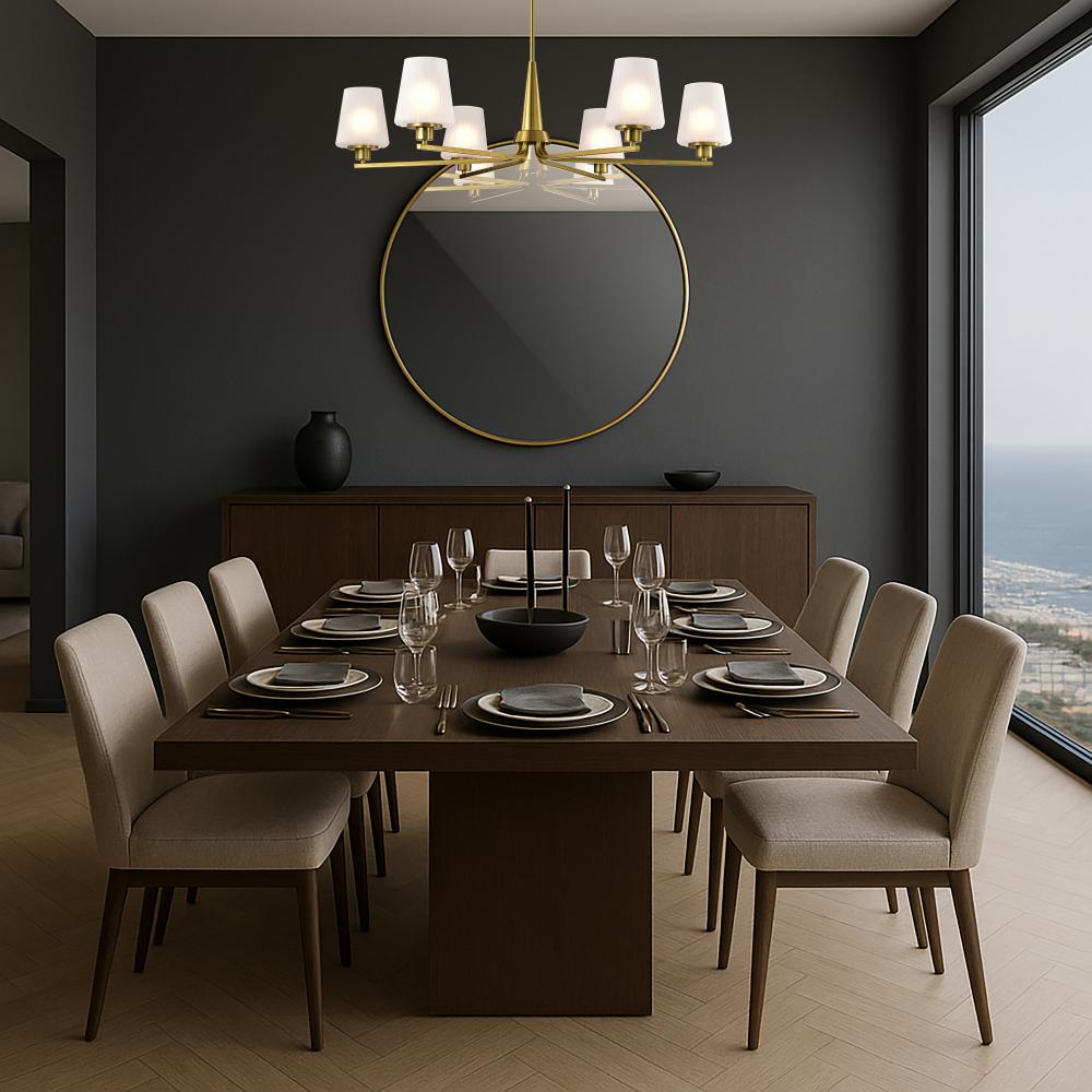 Embrace the classic elegance of the Lune 60-8236 six light chandelier, where updated Mid-Century Modern design meets today's sophisticated style. Featuring graceful lines and thoughtful details, it reimagines retro aesthetics for the contemporary home.