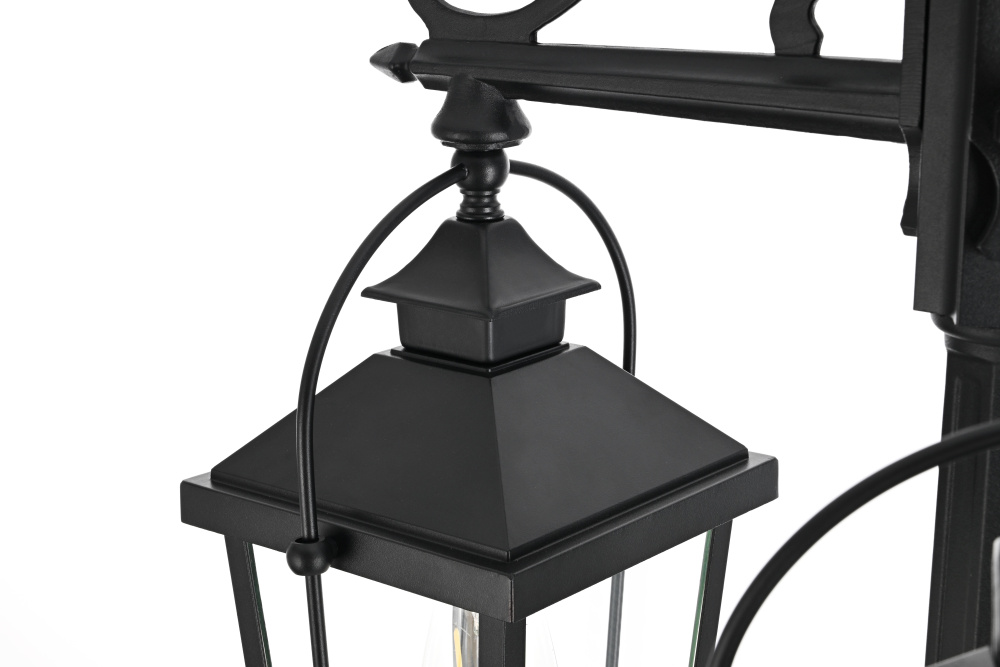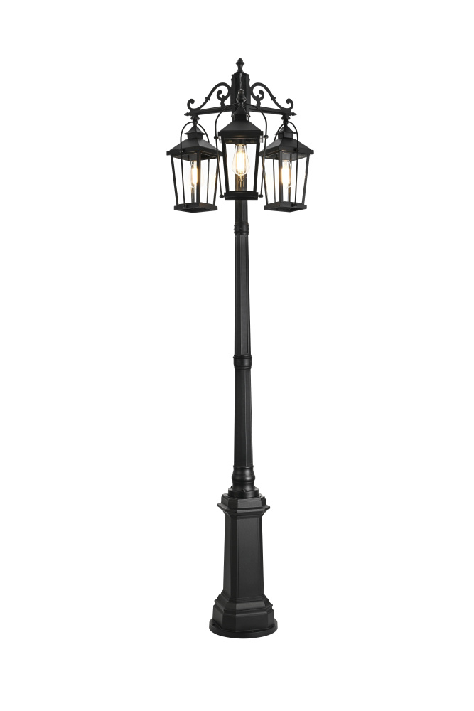 Features three lanterns mounted on gracefully curved arms, providing wide and balanced outdoor lighting.