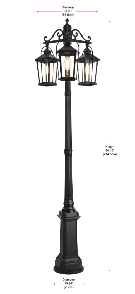 This triple-lantern post light brings a classic streetscape look to outdoor spaces with its ornate scroll detailing, tapered post, and wide-reaching illumination. The three lanterns, suspended from gracefully curved arms, provide a balanced and functional lighting solution for driveways, walkways, and garden spaces. Crafted from iron and aluminum, this fixture is built for durability, while the clear glass panels enhance brightness and visibility. Standing 84.5 inches tall, it makes a strong visual impact while maintaining a refined profile. Designed to use three E26 medium-base bulbs (not included), this fixture is dimmable for adjustable brightness and is ETL Wet Rated for lasting performance in outdoor environments. A statement piece that combines function with intricate detailing, this post light enhances any outdoor setting with its structured and well-balanced design. Built with marine-grade, corrosion-resistant aluminum, this sconce withstands coastal conditions for long-lasting durability.