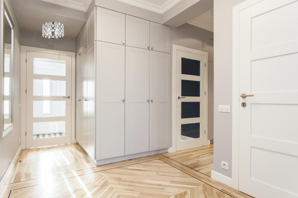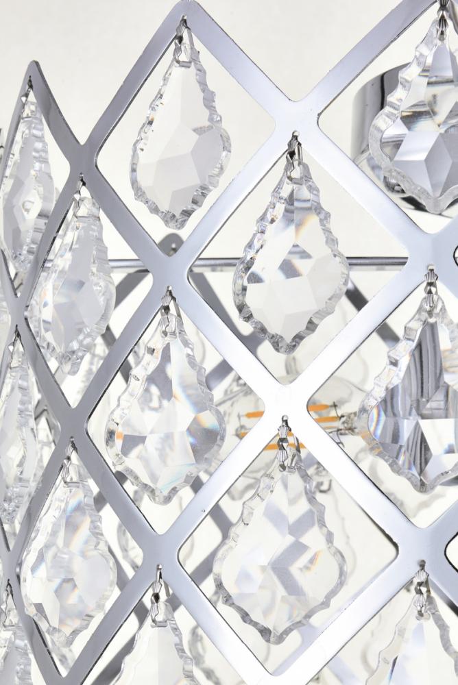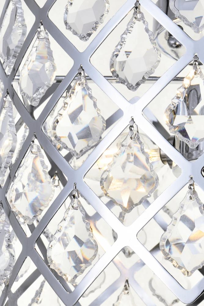 Tiers of clear multi-faceted crystals reflect the soft glow of candelabra bulbs