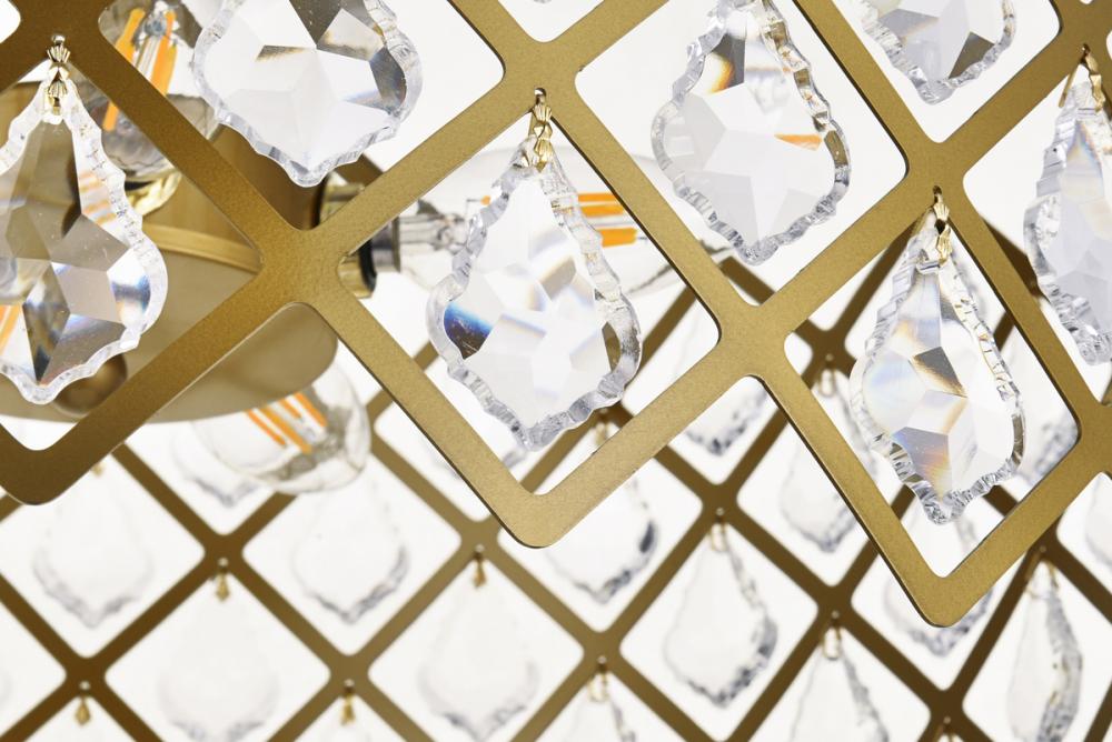 Tiers of clear multi-faceted crystals reflect the soft glow of candelabra bulbs