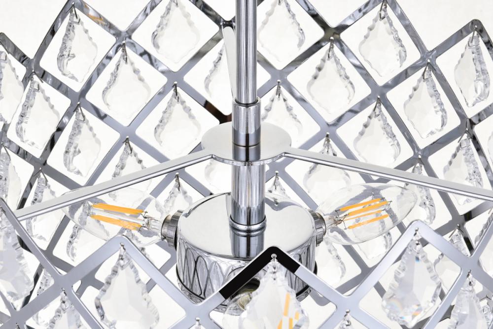Tiers of clear multi-faceted crystals reflect the soft glow of candelabra bulbs