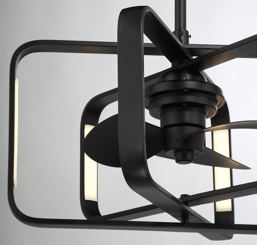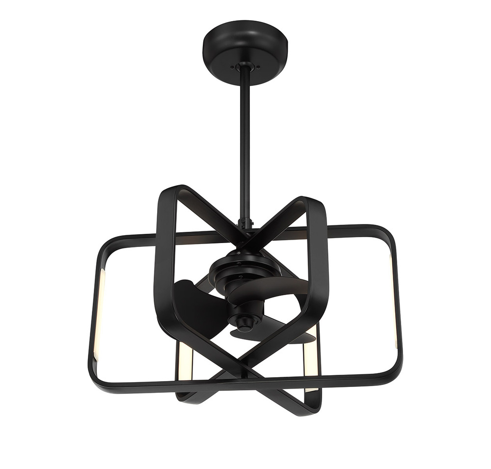 The Savoy House Lynx Fan D'Lier brings a cool and contemporary look to your home. Its open rings articulate and hold integrated LED light sources, can be rotated to customize the look and are finished in Matte Black. Lynx uses an efficient DC motor and has a handheld remote for extra convenience. It is 24" in width and 14" in height. Comes with a 4" downrod and an 18" downrod. Fan D'Liers are a Savoy House exclusive that combines the best of ceiling fans with the best of chandeliers in one fabulously fashionable fixture. These custom designs are inspired by high-end designer styles and take top trends to a whole new level.