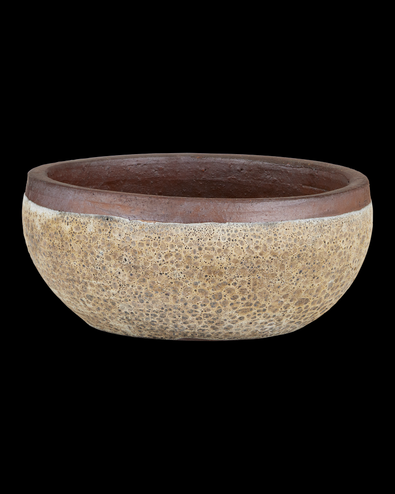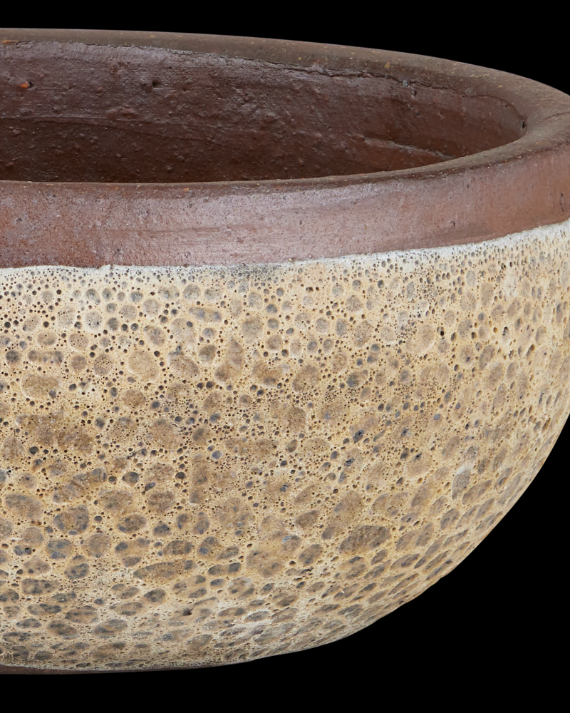 The Lyra Beige Small Planter is a bowl-shaped garden planter with a surface that looks like it has fissures and craters in it thanks to the incredible reactive cream glazing that was applied after the vessel was fired. There is a mottling on the surface of the tan planter that brings it an incredible texture. The Lyra has a drain hole, though the vessel does not come with a plug.
