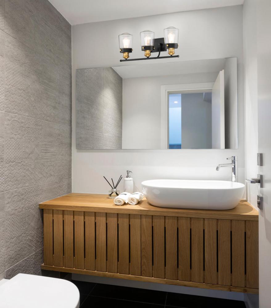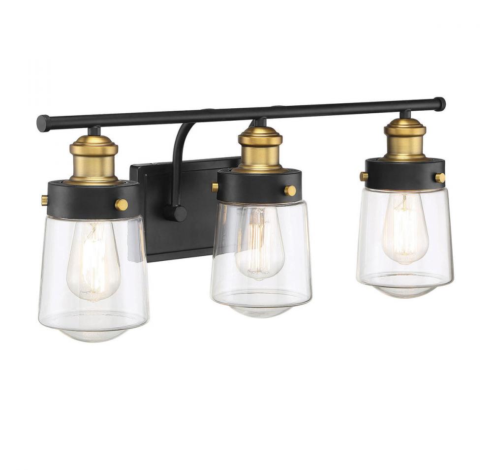 The ever-so-stylish, vintage-inspired look of the Macauley collection from Savoy House is now available as bath lights, including this 3-light bath bar. This fixture expertly combines schoolhouse-style molded glass shades, noticeable details like thumbscrews and the perfect pairing of black and brass to create a look that is sure to please. This fixture is 24" wide and 9.75" tall. It extends 6.75" from the wall. Uses 3 standard size bulbs of up to 60 watts each (not included).