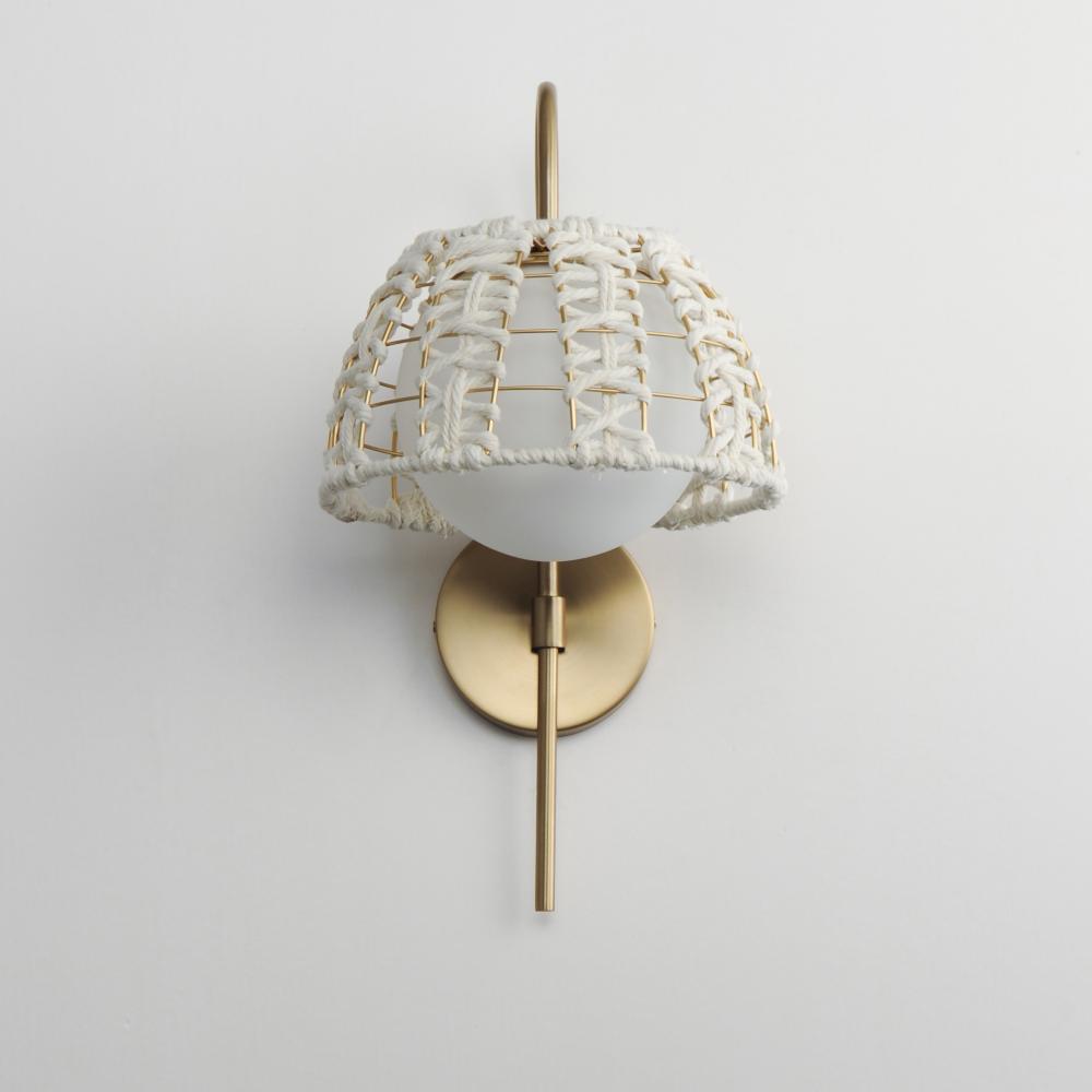 Varied cotton ropes in an Off-White finish are hand woven in a decorative pattern along a metal frame finished in Gold. Housed within these artisanal shades, Satin White glass globes softly diffuse enclosed lamps.