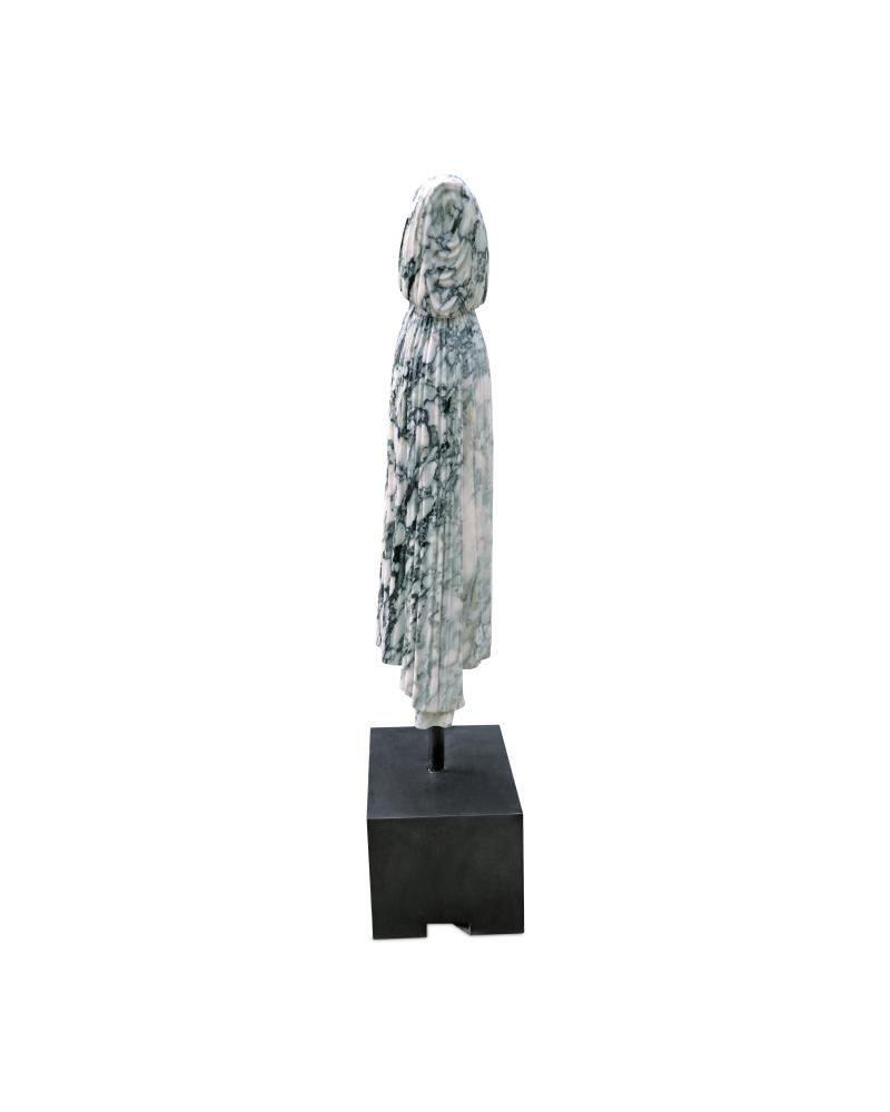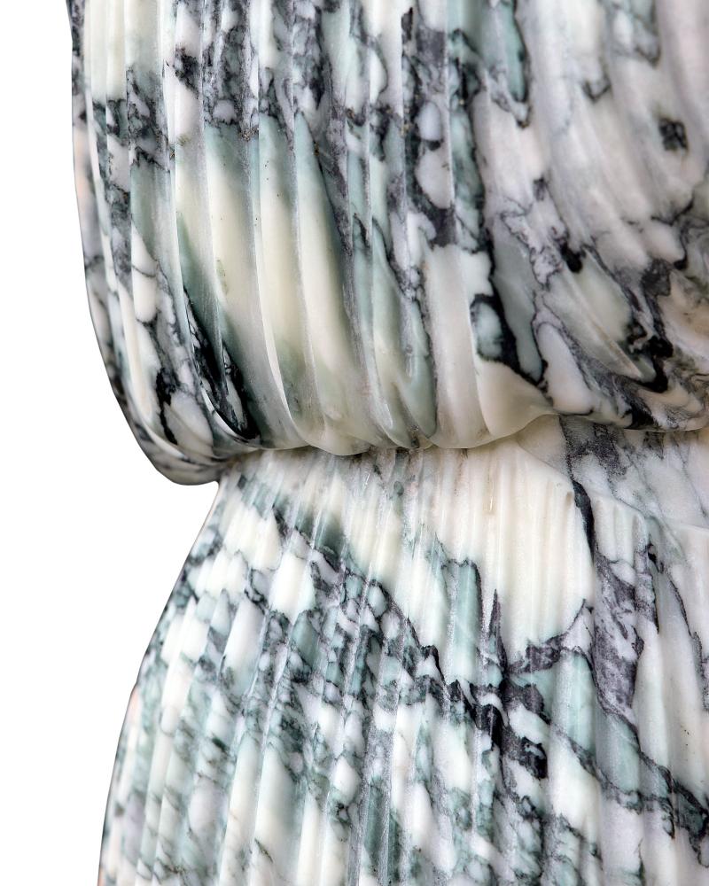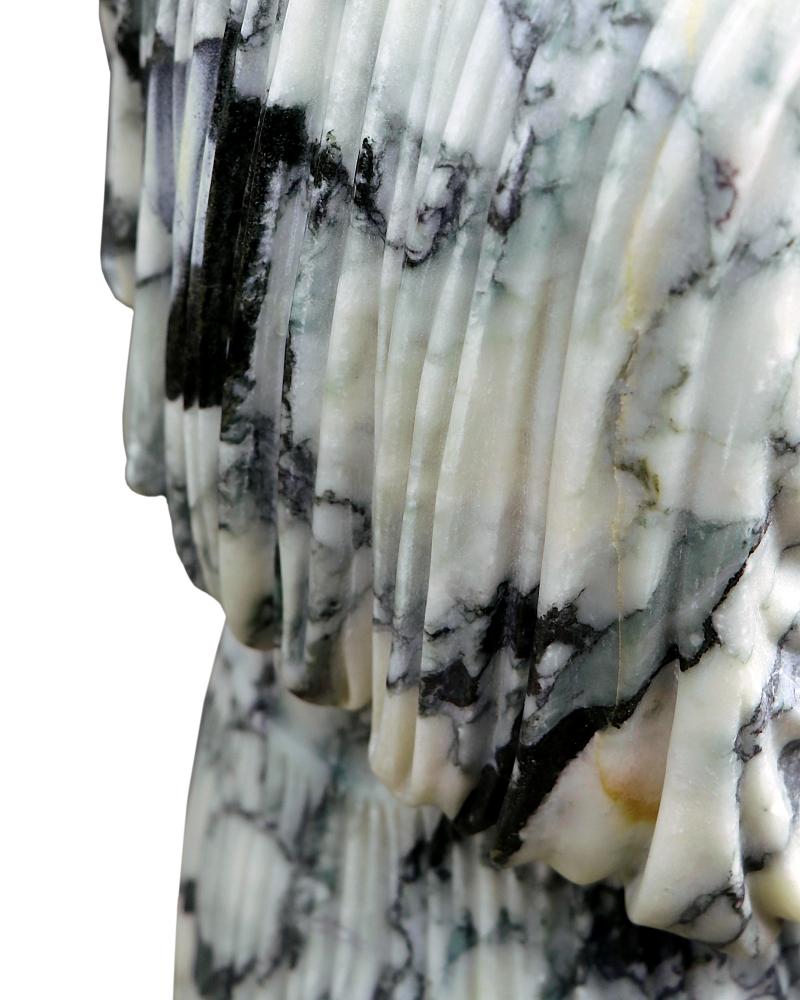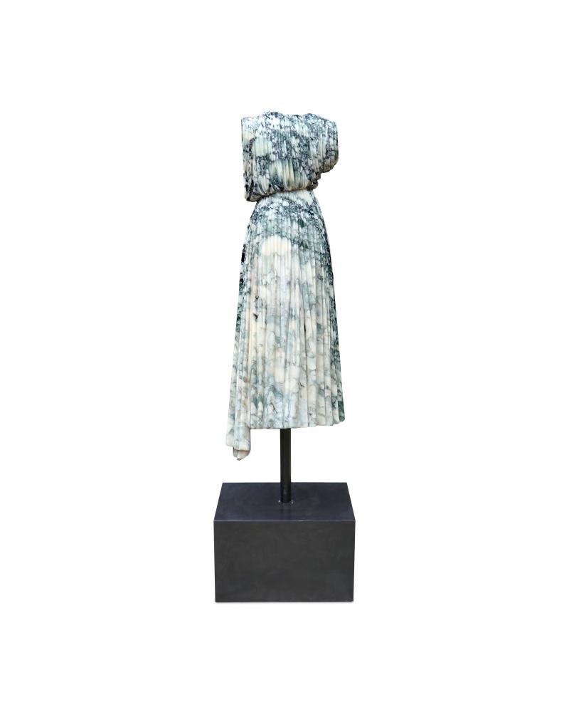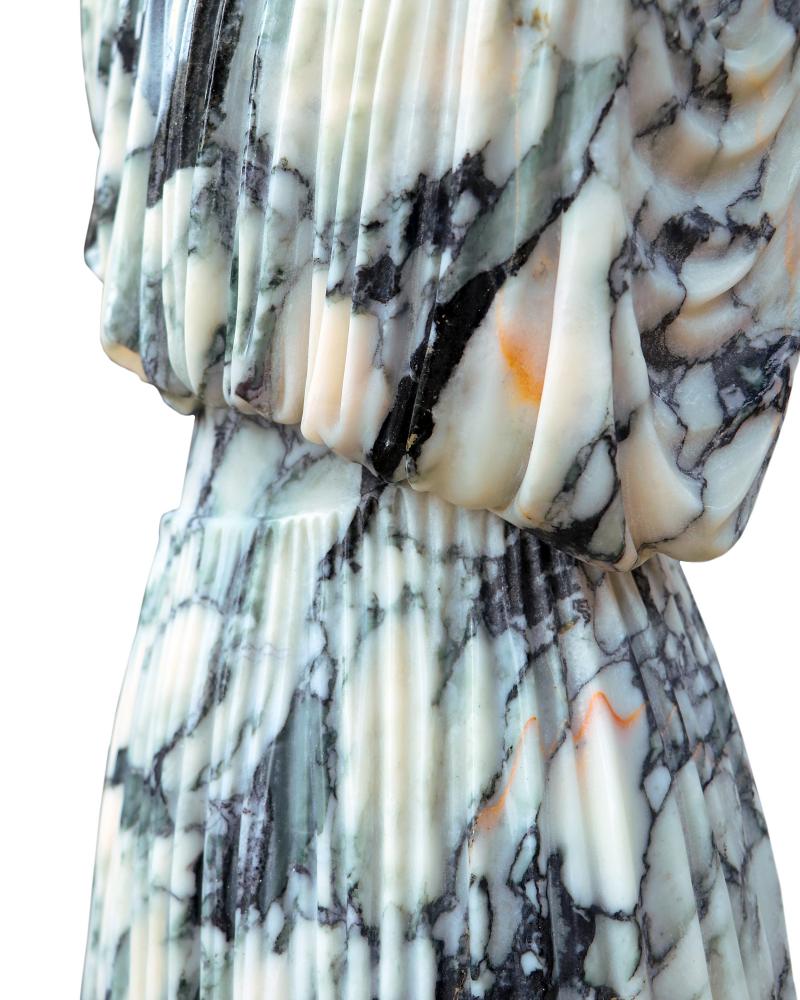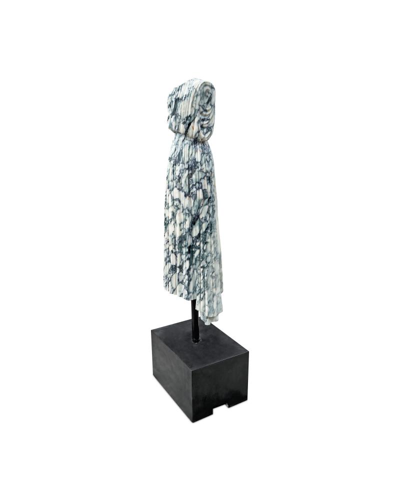 Madame's Cocktail Dress is a limited-edition sculpture with a nod to couture. The carved marble creation was inspired by one of the most famous gowns of a leading French courtier and costume designer. The flowing lines that intersect with the veining in the marble infuse the piece with a marvelous textural quality and a sense of movement. The showtopping blue sculptures, which are mounted on black bases, will have variations on their surfaces due to the natural veining of marble.