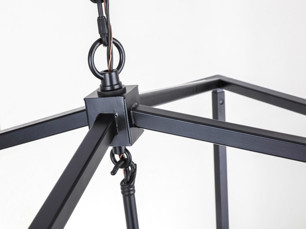 Chandelier with exposed bulbs hang from center as metal frame accentuates the fixture's stunning beauty