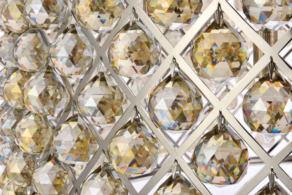 Modern simplicity meets organic beauty in the breathtakingly unique Madison collection. Hand-polished, multifaceted clear, golden-teak, or Silver-shade crystal spheres shimmer like dewdrops in a circular forged-iron grid with a golden-iron, mocha-brown, or polished-nickel finish. These airy pendant lamps will brighten up a kitchen, dining room, foyer, or stairwell in an explosion of reflected light.