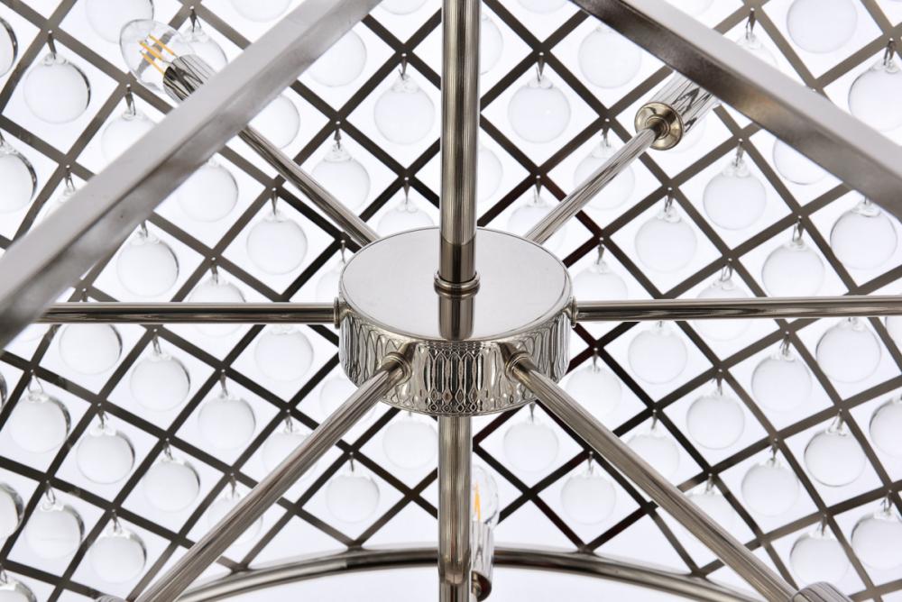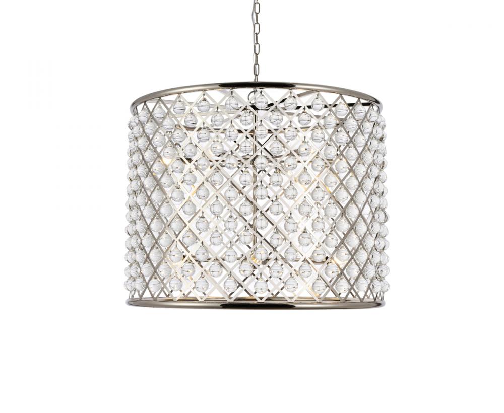 Modern simplicity meets organic beauty in the breathtakingly unique Madison collection. Hand-polished, multifaceted clear crystal spheres shimmer like dewdrops in a circular forged-iron grid with a golden-iron, mocha-brown, or polished-nickel finish. These airy pendant lamps will brighten up a kitchen, dining room, foyer, or stairwell in an explosion of reflected light.