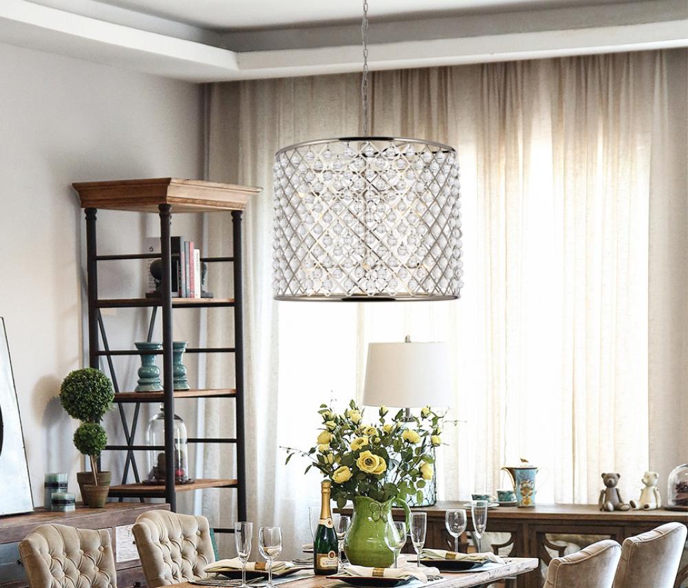 Lamp features a diameter of 35.5 inches, a height of 28 inches, a minimum hanging length of 34 inches, a maximum hanging length of 88 inches, and requires 12 candelabra bulbs