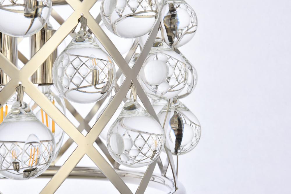 Modern simplicity meets organic beauty in the breathtakingly unique Madison collection. Hand-polished, smooth clear crystal spheres shimmer like dewdrops in a circular forged-iron grid with a golden-iron, mocha-brown, or polished-nickel finish. These airy pendant lamps will brighten up a kitchen, dining room, foyer, or stairwell in an explosion of reflected light.