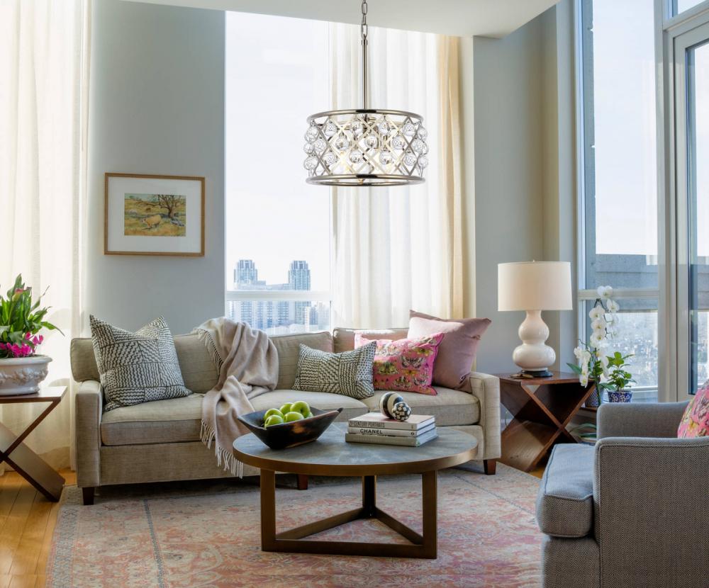 Lamp features a diameter of 16 inches, a height of 9 inches, a minimum hanging length of 15 inches, a maximum hanging length of 69 inches, and requires 4 candelabra bulbs