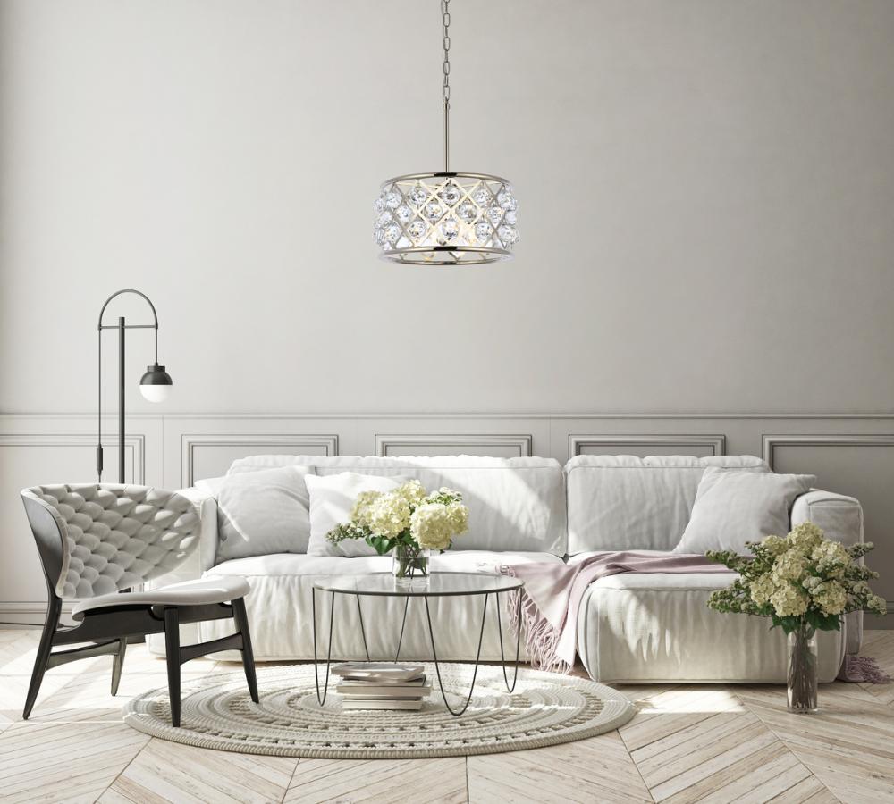 Lamp features a diameter of 16 inches, a height of 9 inches, a minimum hanging length of 15 inches, a maximum hanging length of 69 inches, and requires 4 candelabra bulbs