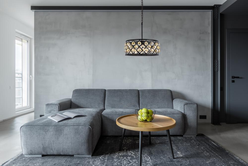 Circular steel frame and forged-iron grid suspended from a steel chain in a matte black finish